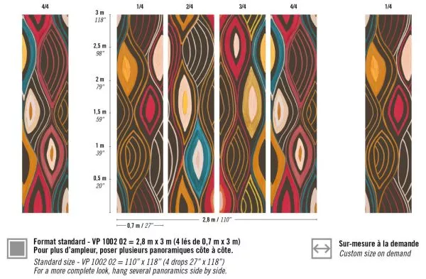 Measurements +/- 3% : Standard of 2.8 m x 3 m (110''x118'') available in 4 drops of 0.7 m (27") or Custom size