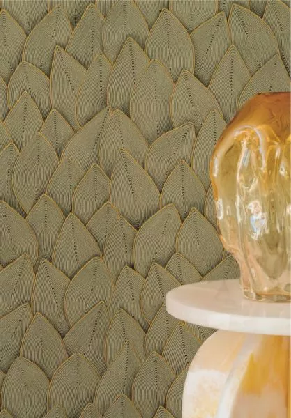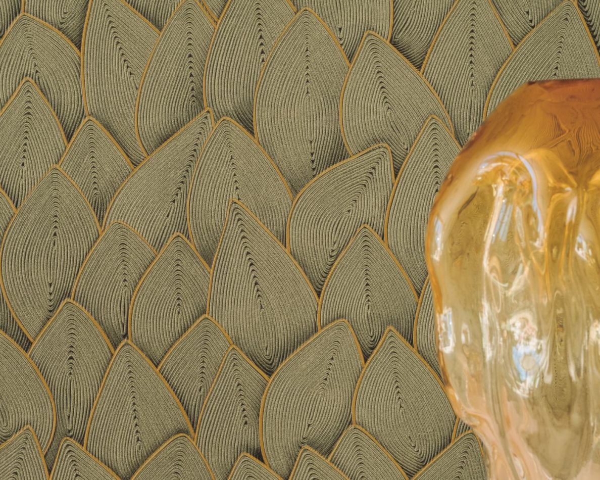The ideas of Véronique de Soultrait come to life here, as knots of rope and cord are untied, connecting these materials with the modern world. The artist elevates the art of braiding to its highest level, introducing rope and cord into the painterly realm of Art Deco. These creations, both free-flowing and meticulously detailed, feature curved lines in the form of graphic figures, endlessly intertwined patterns, or geometrically structured compositions. The repeating wave motifs reveal the artist’s signature interior designs, highlighting the patience in her work. The colors, with hints of metallic thread, captivate with their subtle nuances.