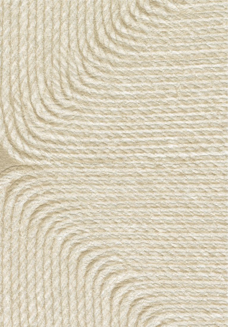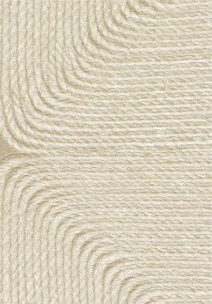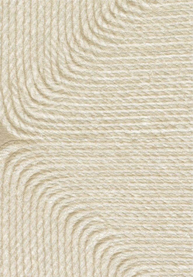 The ideas of Véronique de Soultrait come to life here, as knots of rope and cord are untied, connecting these materials with the modern world. The artist elevates the art of braiding to its highest level, introducing rope and cord into the painterly realm of Art Deco. These creations, both free-flowing and meticulously detailed, feature curved lines in the form of graphic figures, endlessly intertwined patterns, or geometrically structured compositions. The repeating wave motifs reveal the artist’s signature interior designs, highlighting the patience in her work. The colors, with hints of metallic thread, captivate with their subtle nuances.