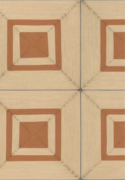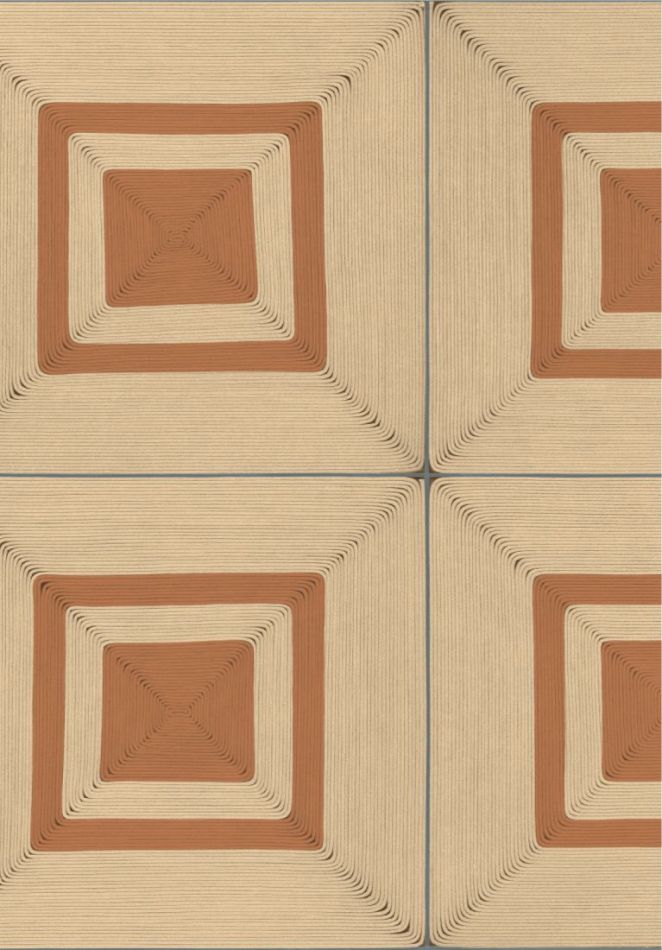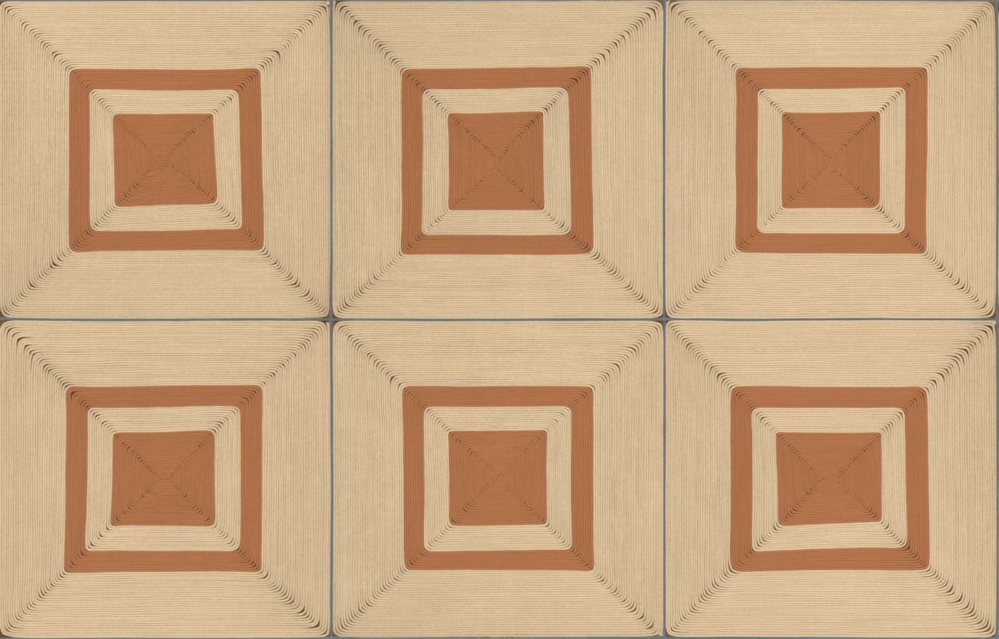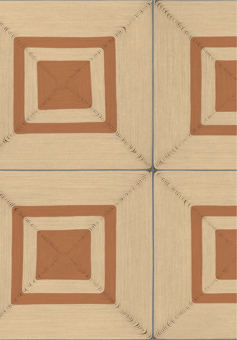 The ideas of Véronique de Soultrait come to life here, as knots of rope and cord are untied, connecting these materials with the modern world. The artist elevates the art of braiding to its highest level, introducing rope and cord into the painterly realm of Art Deco. These creations, both free-flowing and meticulously detailed, feature curved lines in the form of graphic figures, endlessly intertwined patterns, or geometrically structured compositions. The repeating wave motifs reveal the artist’s signature interior designs, highlighting the patience in her work. The colors, with hints of metallic thread, captivate with their subtle nuances.