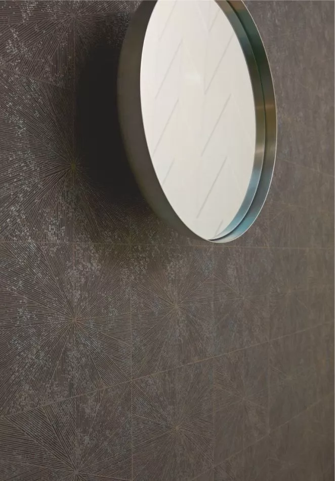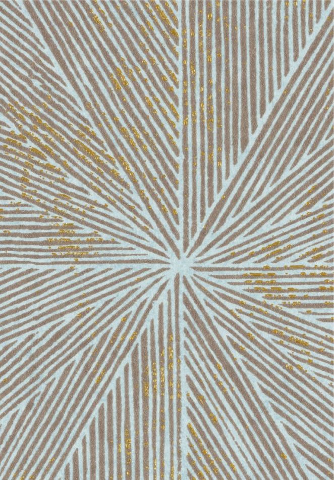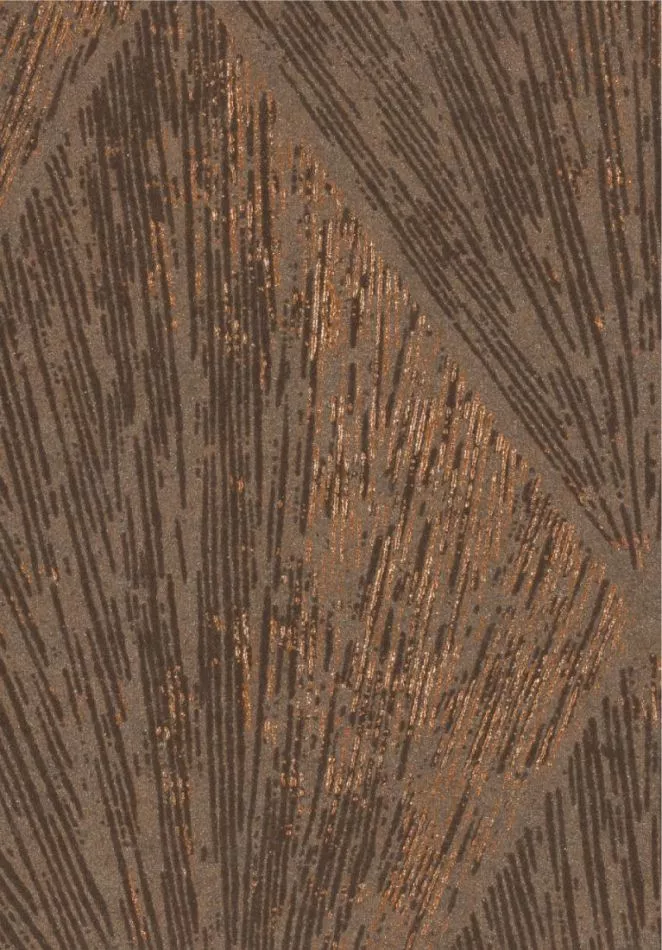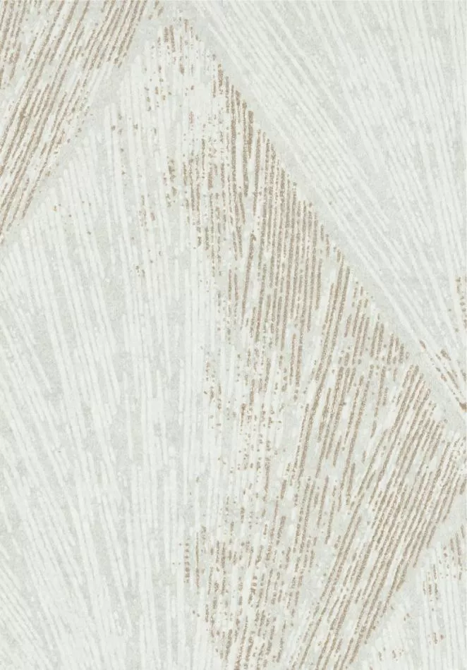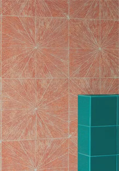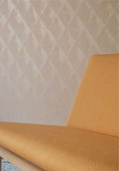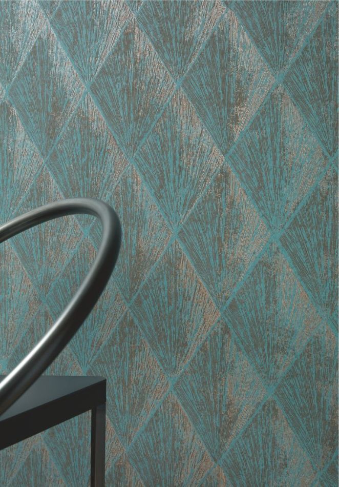 In an art deco movement, this collection borrows the codes of marquetry and the geometric beams of the 1930s to interpret them on wallpaper. Through screen printing, it reveals its inks in relief, as if each line of the decoration was painted by hand. Its colors combine matte with metallic: copper, silver and colored gold, as well as coral, white or cyan blue.