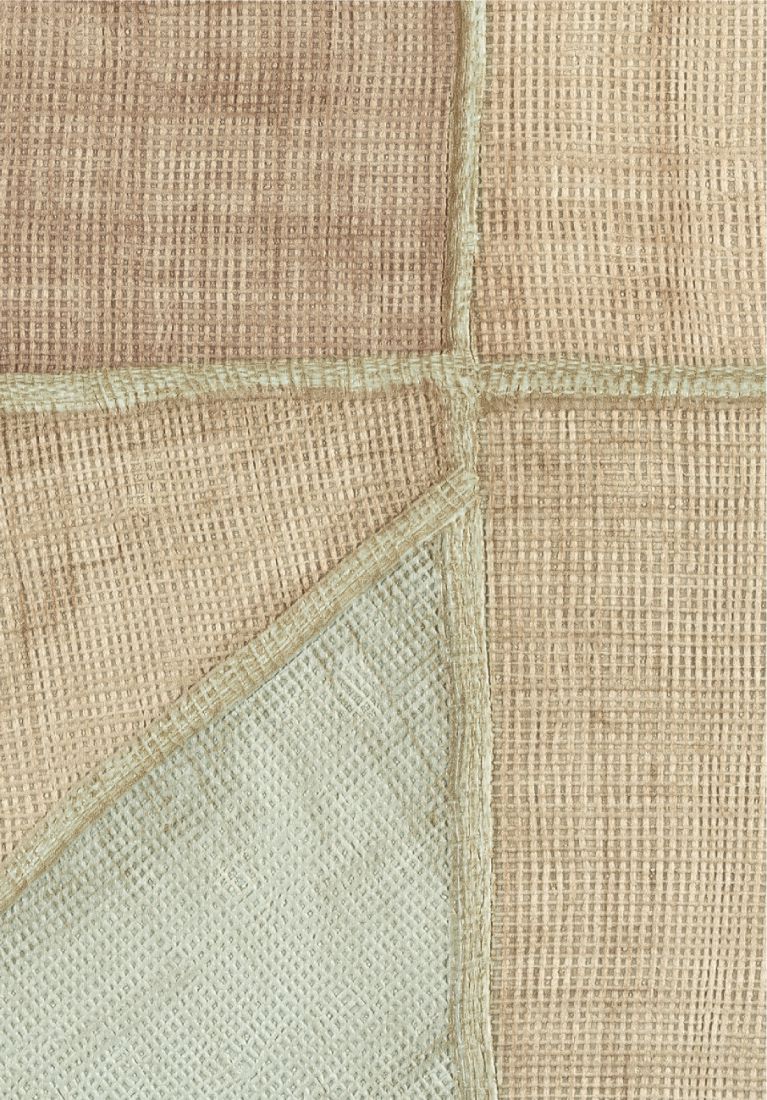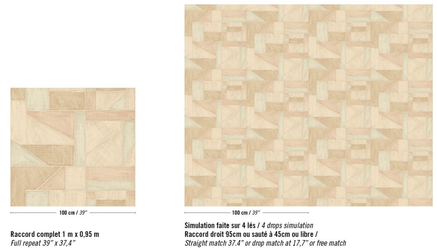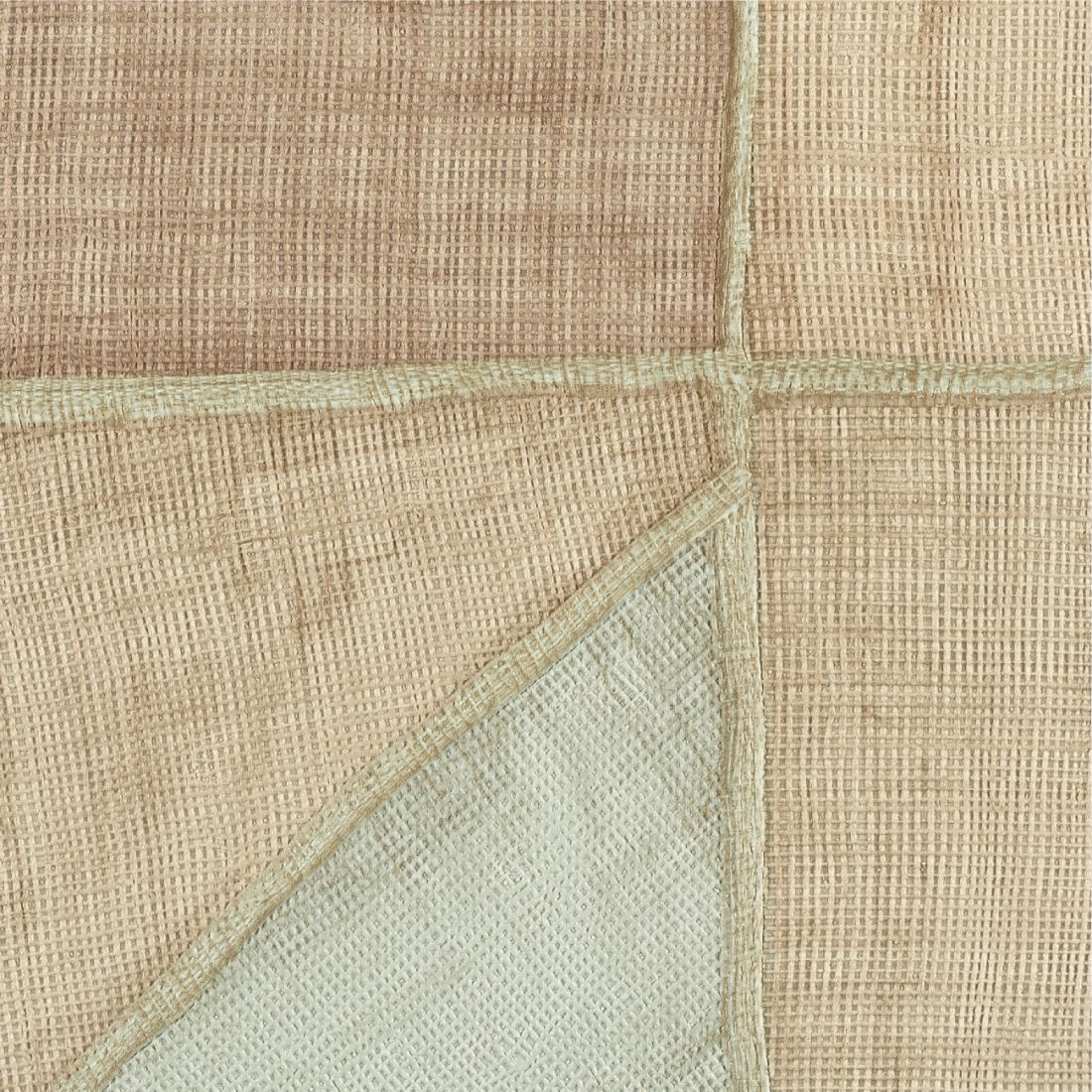 This collection was conceived as a sequel to the Eldorado wallcovering collection, based on the Atelier d'Artiste design. It originates from the discovery of the Korean fabric, Pojagi. These textiles used to wrap gifts and objects (Chogak is the popular term) are composed of several fabrics. They are reinterpreted here in pattern layouts of coated canvas, reflecting a raffia or abaca effect in serene and melodic colors, almost chalky for some: terracotta, powdery pinks, lake greens and blues, natural whites.