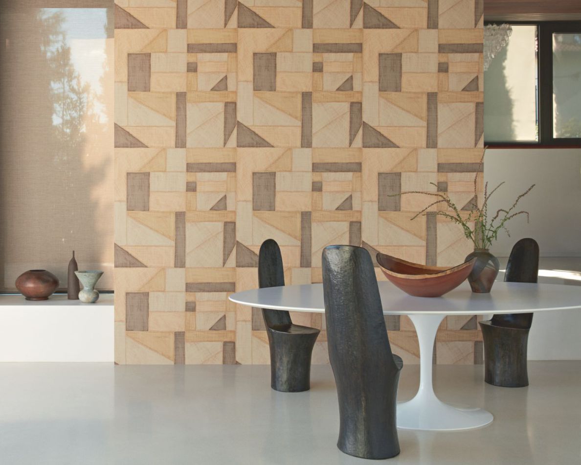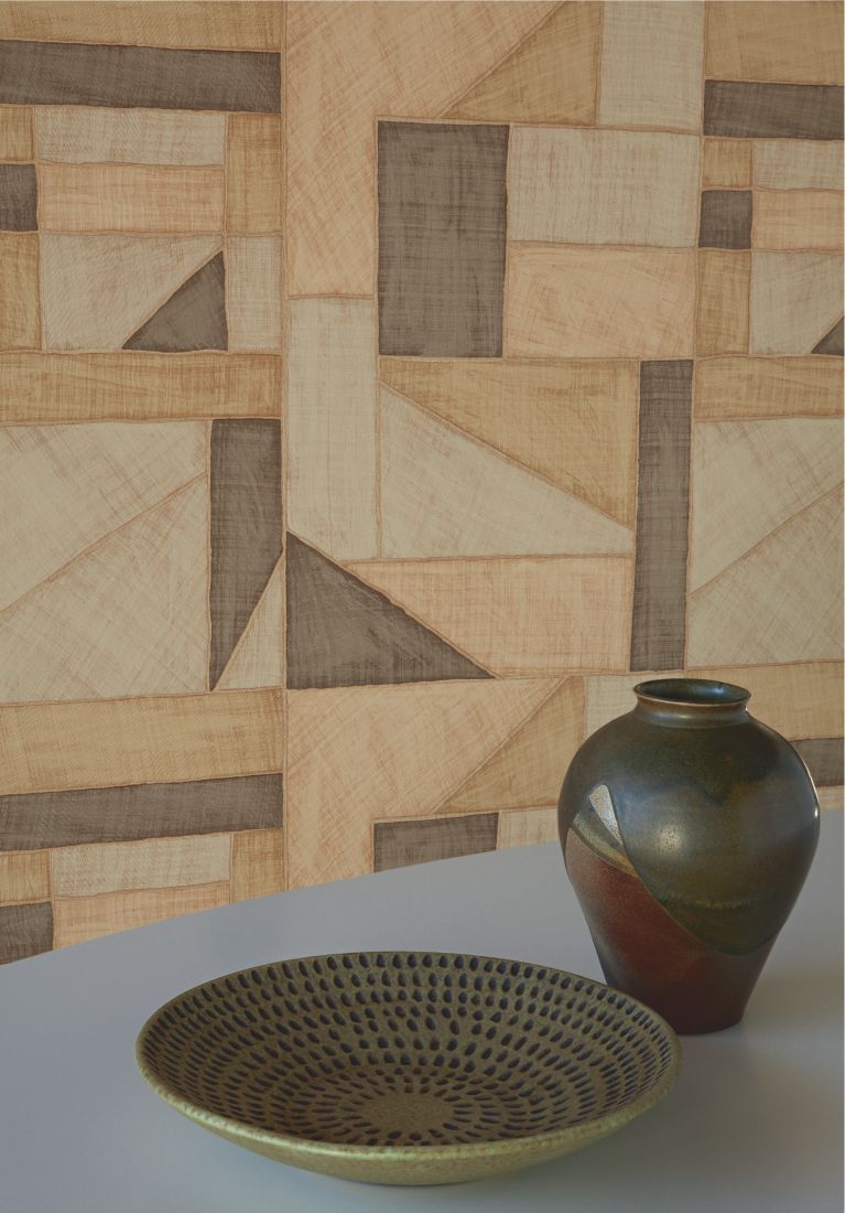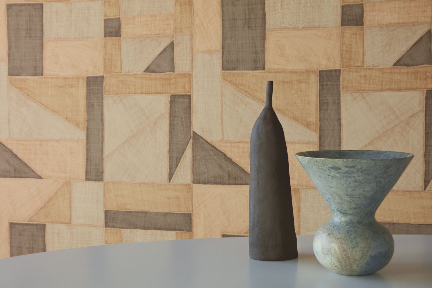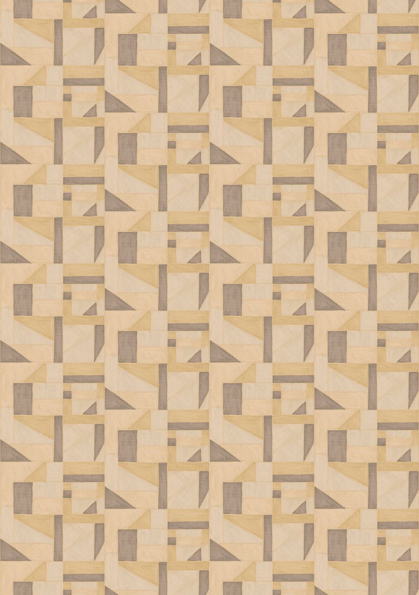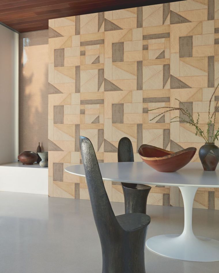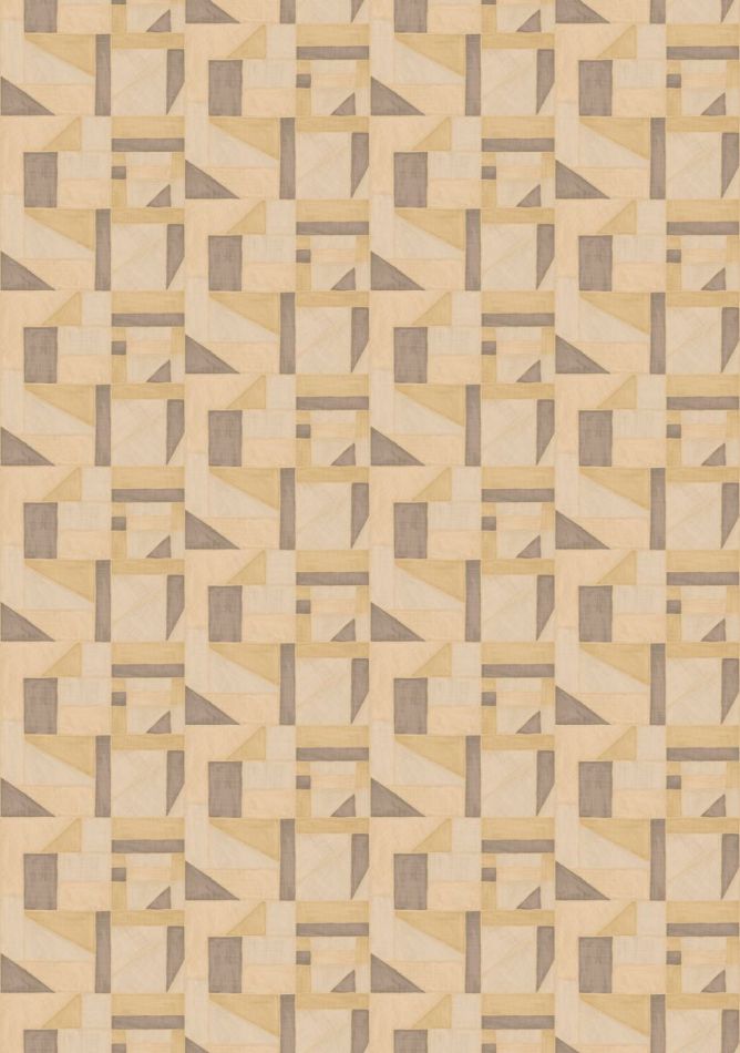This collection was conceived as a sequel to the Eldorado wallcovering collection, based on the Atelier d'Artiste design. It originates from the discovery of the Korean fabric, Pojagi. These textiles used to wrap gifts and objects (Chogak is the popular term) are composed of several fabrics. They are reinterpreted here in pattern layouts of coated canvas, reflecting a raffia or abaca effect in serene and melodic colors, almost chalky for some: terracotta, powdery pinks, lake greens and blues, natural whites.