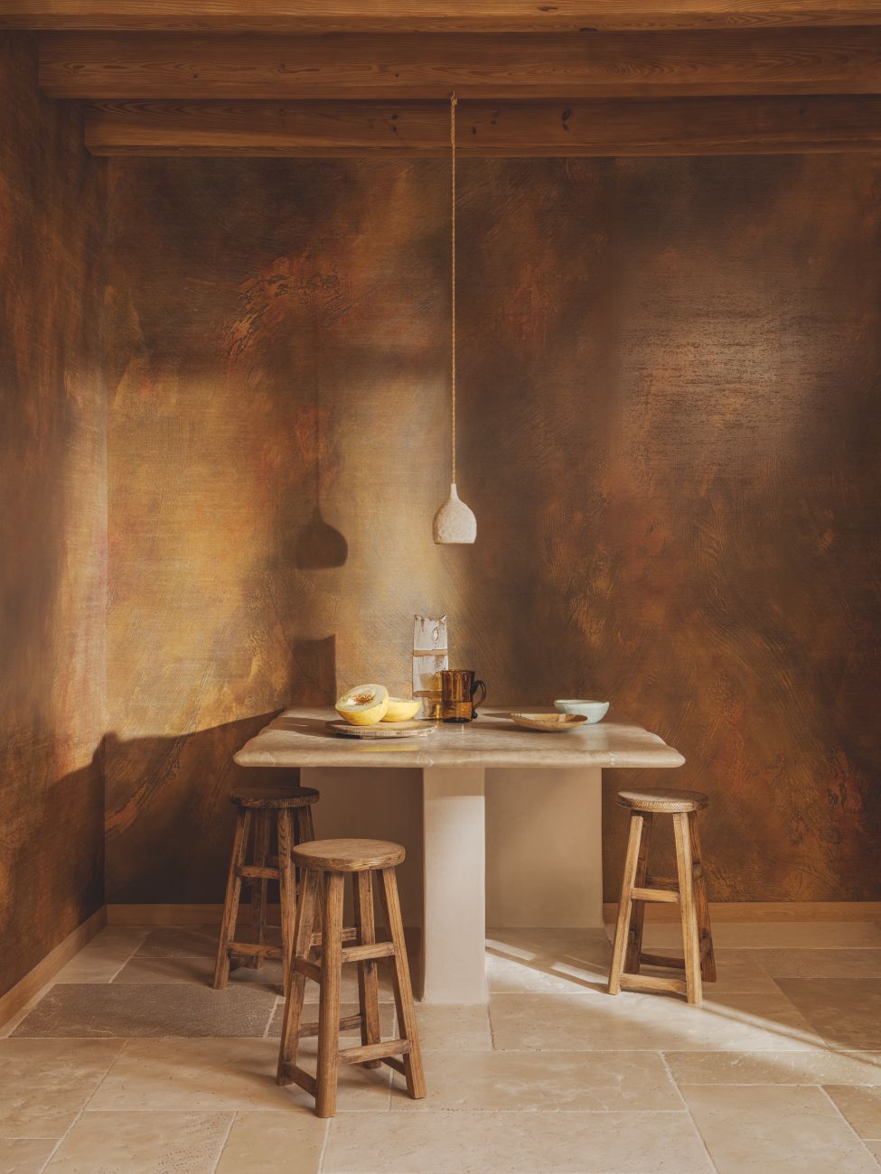 Fascinated by the raw energy of minerals, the Lanzarote collection transforms them into spectacular works of art. Far from being static, stone transcends immobility to become fluid and moving. Semi-precious undulations come in luminescent hues. Raw rock unveils quartz chips, terrazzo fragments and sparkling inlays, like hidden gems. Travertine, veined with light, offers a soft glow. Onyx creates a monumental mineral landscape. Each creation sculpts a world of unknown powers, enhanced by the eternal colours of stone and metal: basalt, aquamarine, amber yellow, gold, silver...