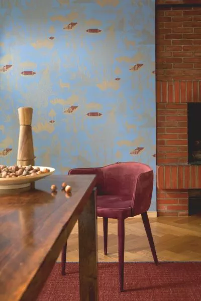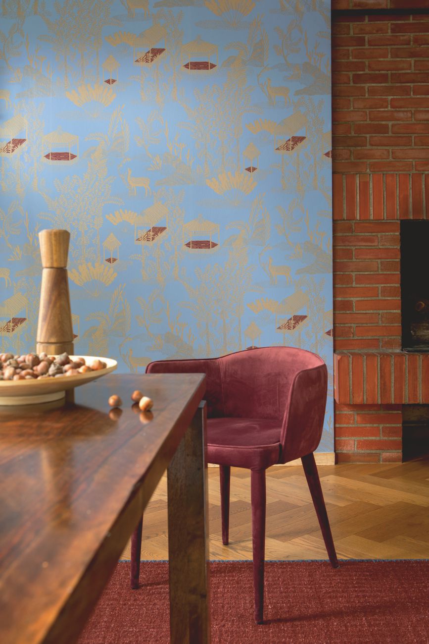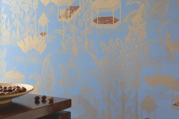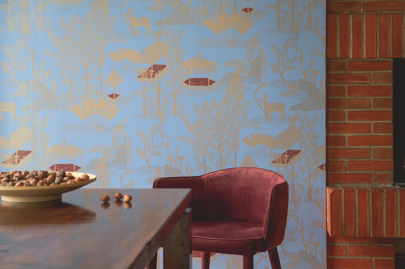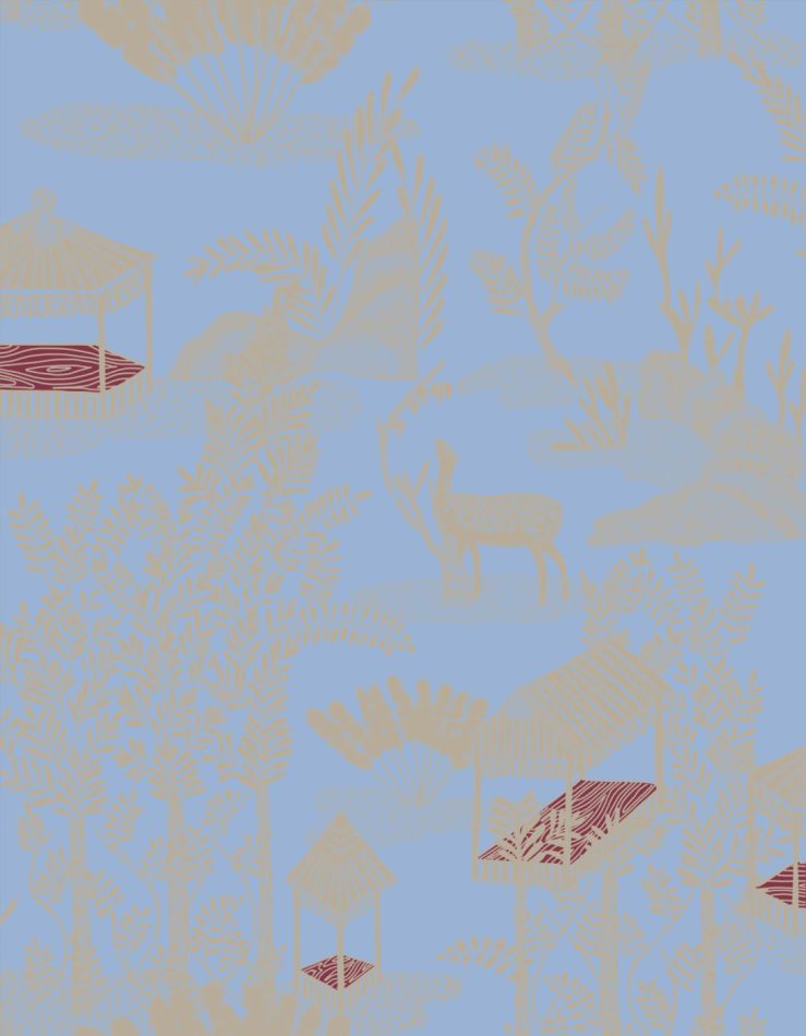 A wallpaper collection inspired by Indian miniature painting: colored, stylized depictions of scenes from everyday life. 5 designs and 3 panorama motifs.