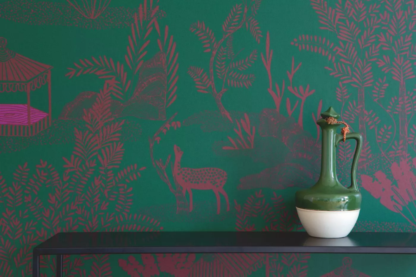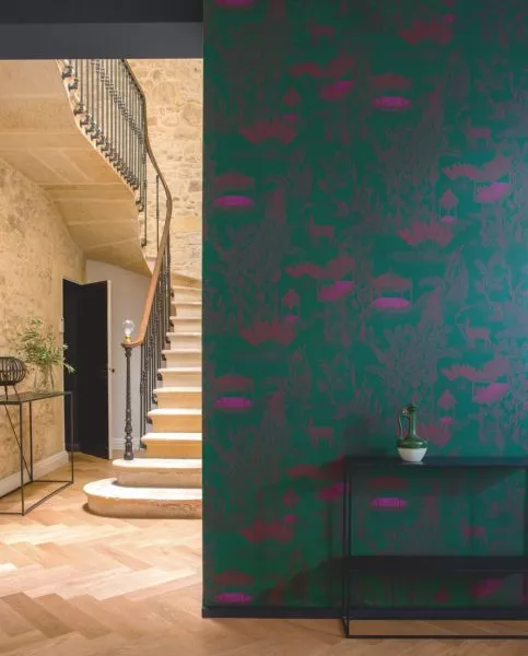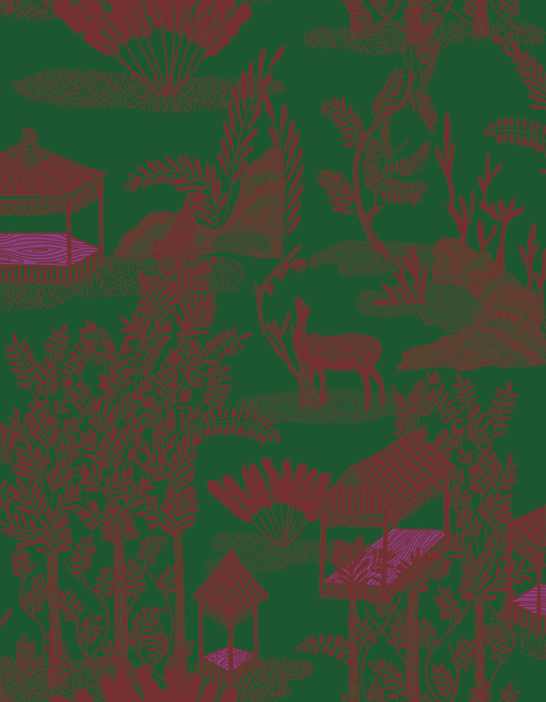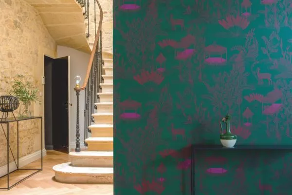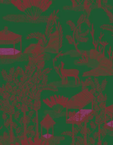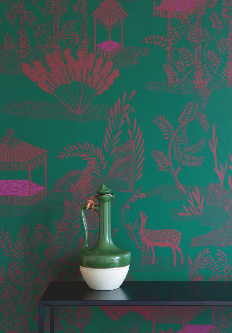 A wallpaper collection inspired by Indian miniature painting: colored, stylized depictions of scenes from everyday life. 5 designs and 3 panorama motifs.
