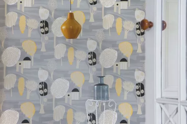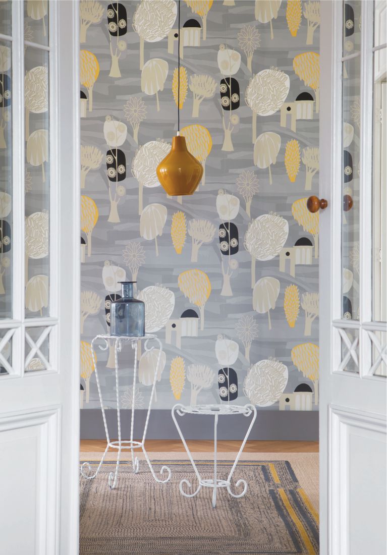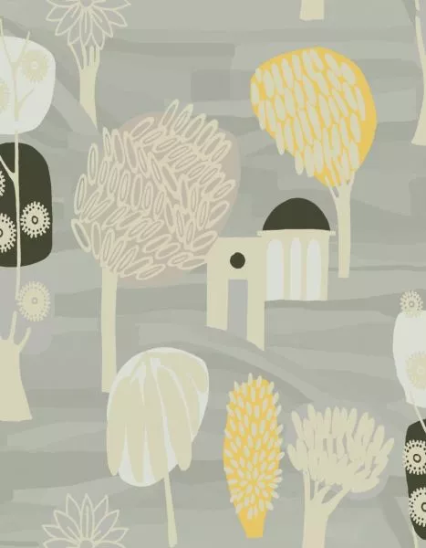 A wallpaper collection inspired by Indian miniature painting: colored, stylized depictions of scenes from everyday life. 5 designs and 3 panorama motifs.