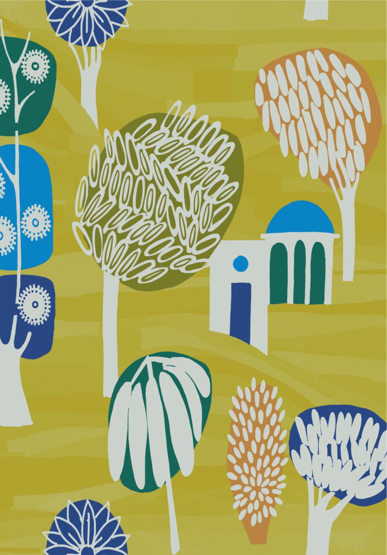 A wallpaper collection inspired by Indian miniature painting: colored, stylized depictions of scenes from everyday life. 5 designs and 3 panorama motifs.