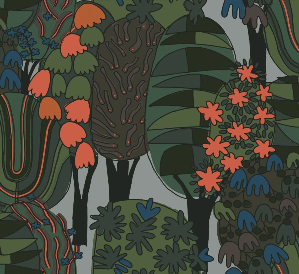A wallpaper collection inspired by Indian miniature painting: colored, stylized depictions of scenes from everyday life. 5 designs and 3 panorama motifs.