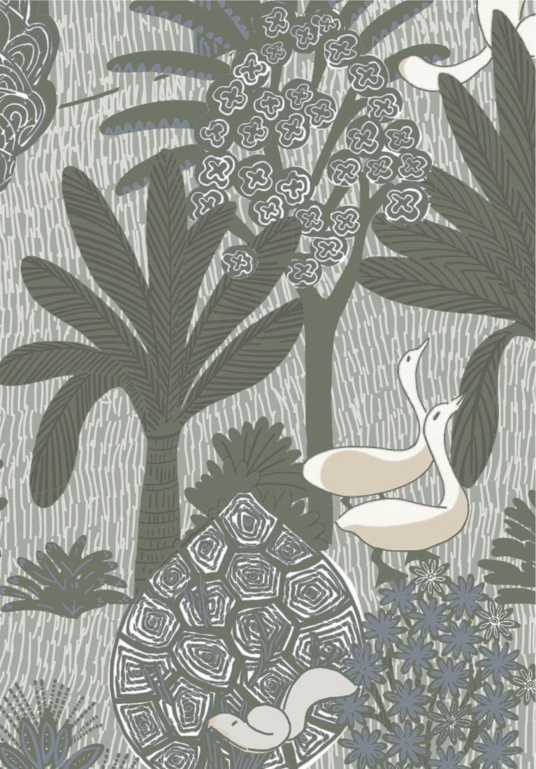 A wallpaper collection inspired by Indian miniature painting: colored, stylized depictions of scenes from everyday life. 5 designs and 3 panorama motifs.