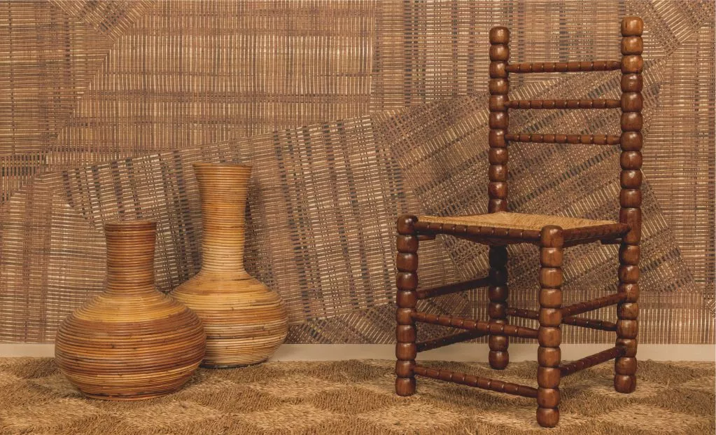 Abaca is revealed through weaving. Raffia threads meet banana tree fibre. Natural rattan expresses its authenticity in marquetry. A palm tree gets brought to light by delicate calepinage…
