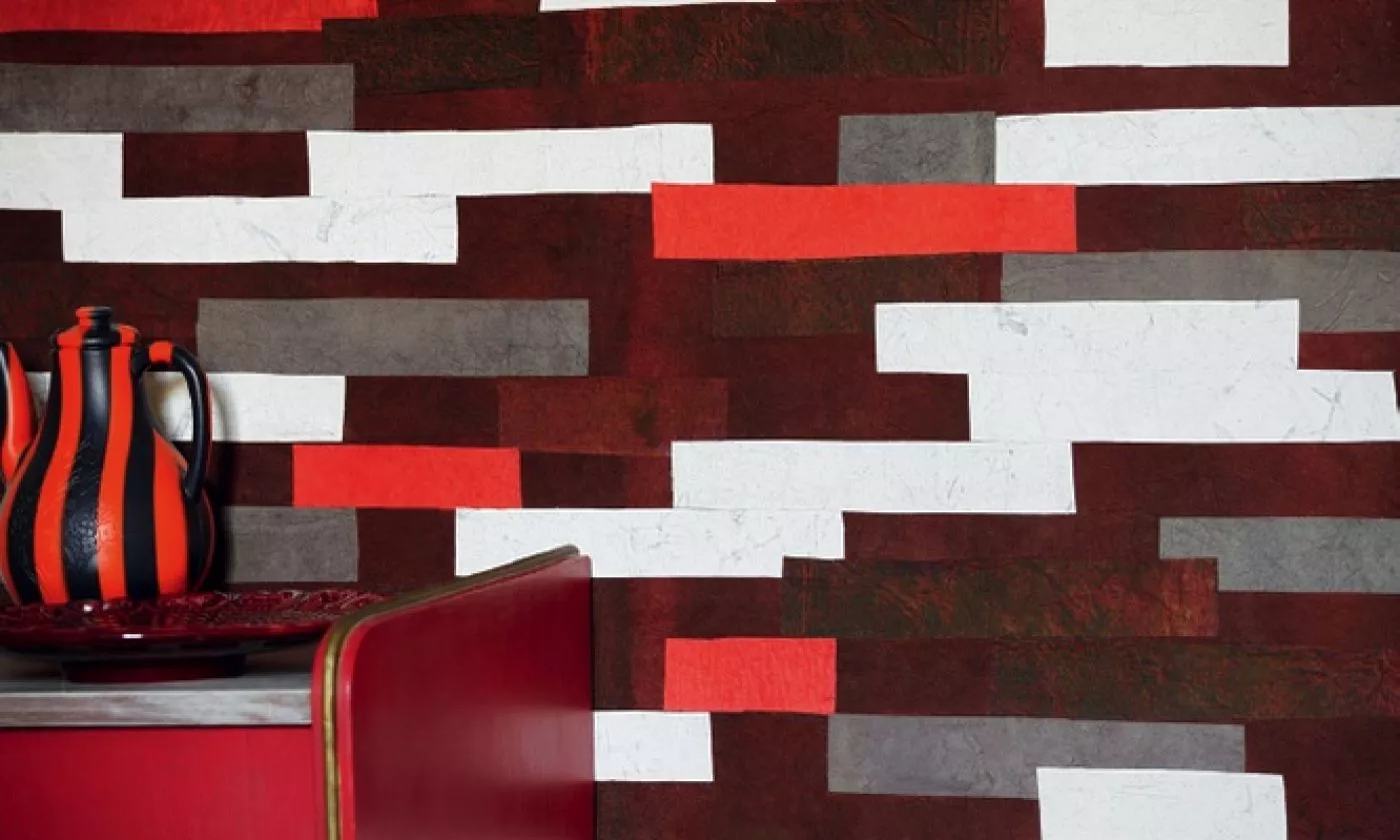 Ribbons in handcrafted paper, aligned and glued by hand, in a side by side and random layout, like a Paul Klee painting.