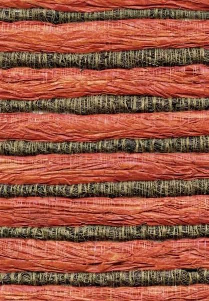 The breeze quickly changes and the azure sky fills with dark clouds, a tropical storm. A man continues on with his task, braving the strong wind with the rain sweeping in from time to time, leaving its signature on his work. Océania is the fruit of this fascinating triptych: banana bark, palm wood and raw textures are tamed by ancient human craft, constantly subject to the laws of nature.
