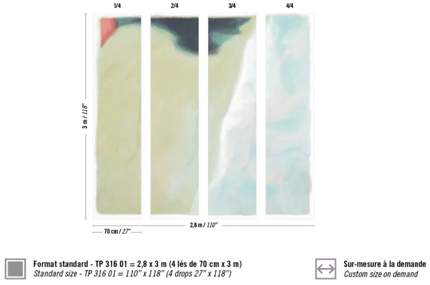 Measurements +/- 3% : Standard of 2.8m x 3m (110''x118'') available in 4 drops of 0.7m (27") or Custom size