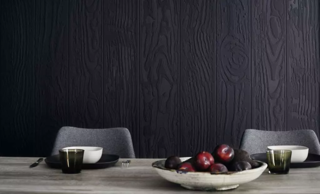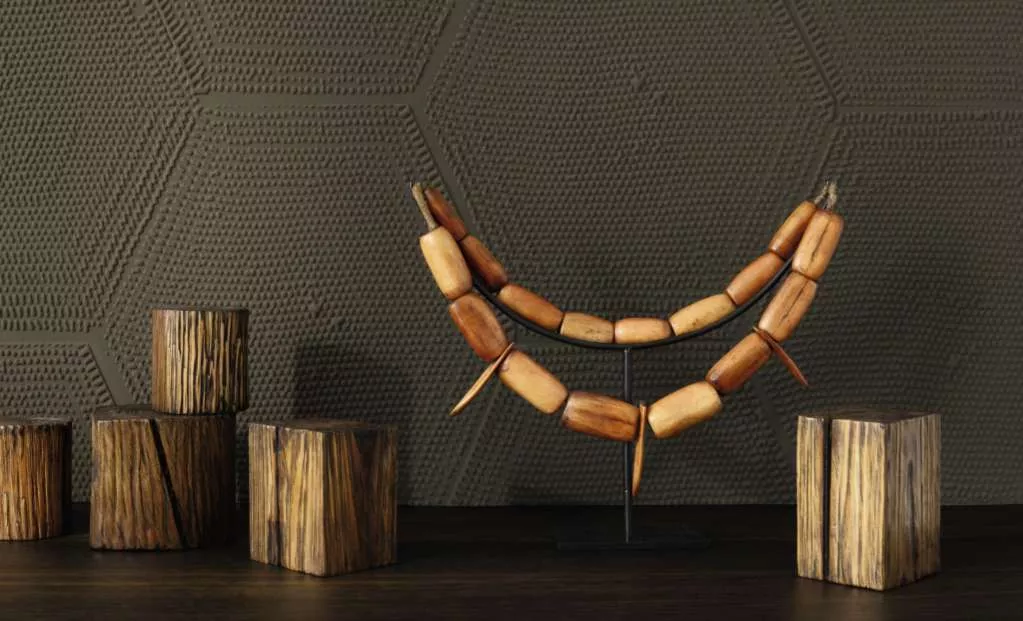 Magnified, patterns become liberated, taking on amazing forms. The grains of virtual wood, punctuated with random graphics, ramble across the textured walls. Chunky knit, unravels verticals, led by giant hands. In subtle interplay, light and shadows chase each other, slaloming down geometric scales while soft honeycomb shapes evoke floor to ceiling building block playsets.
