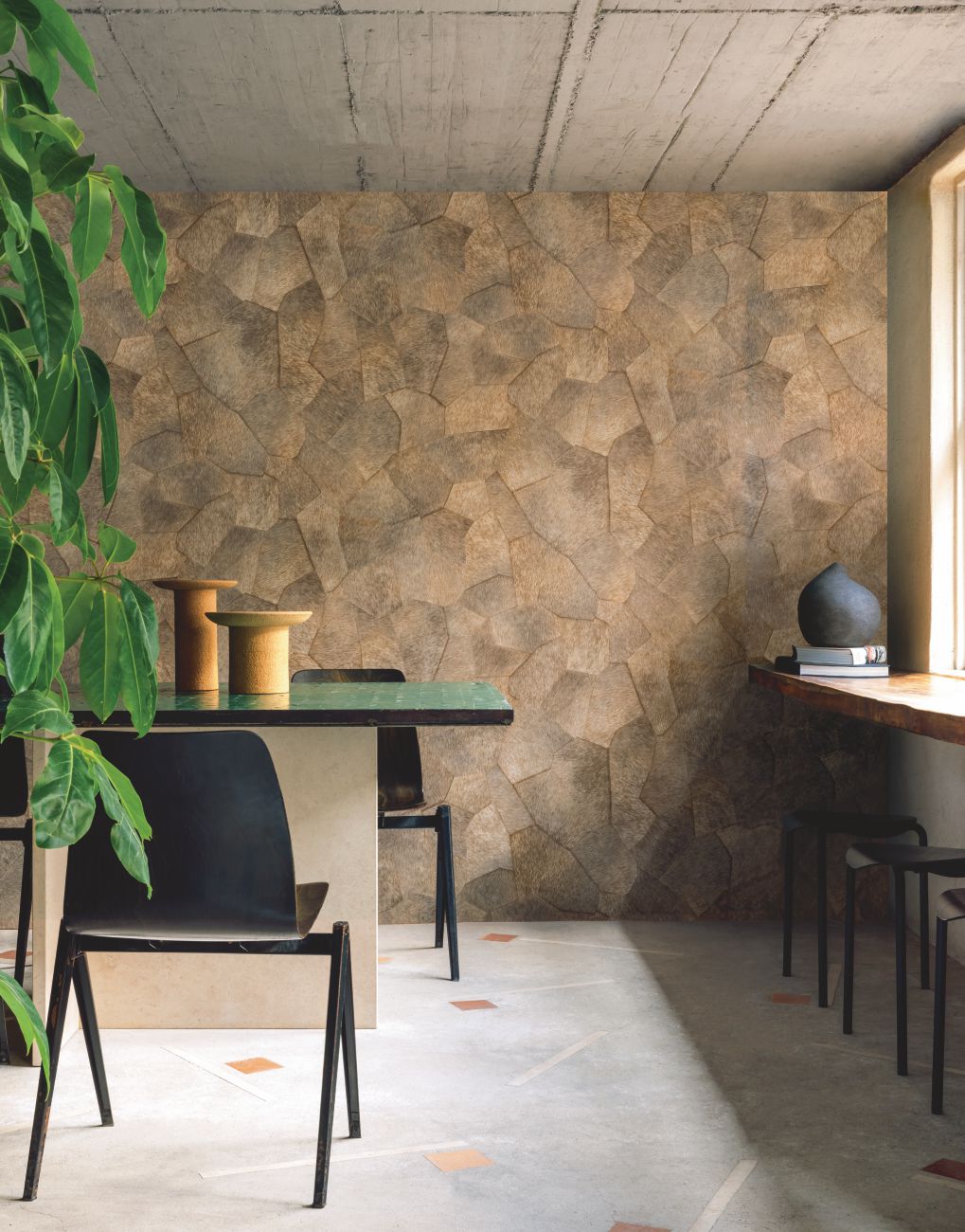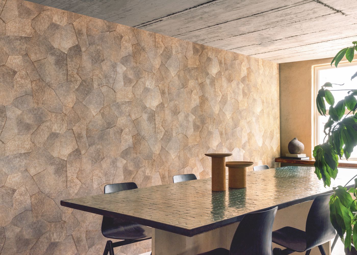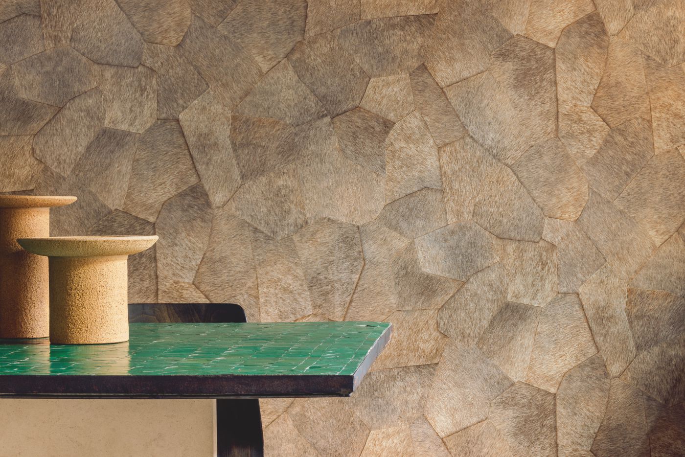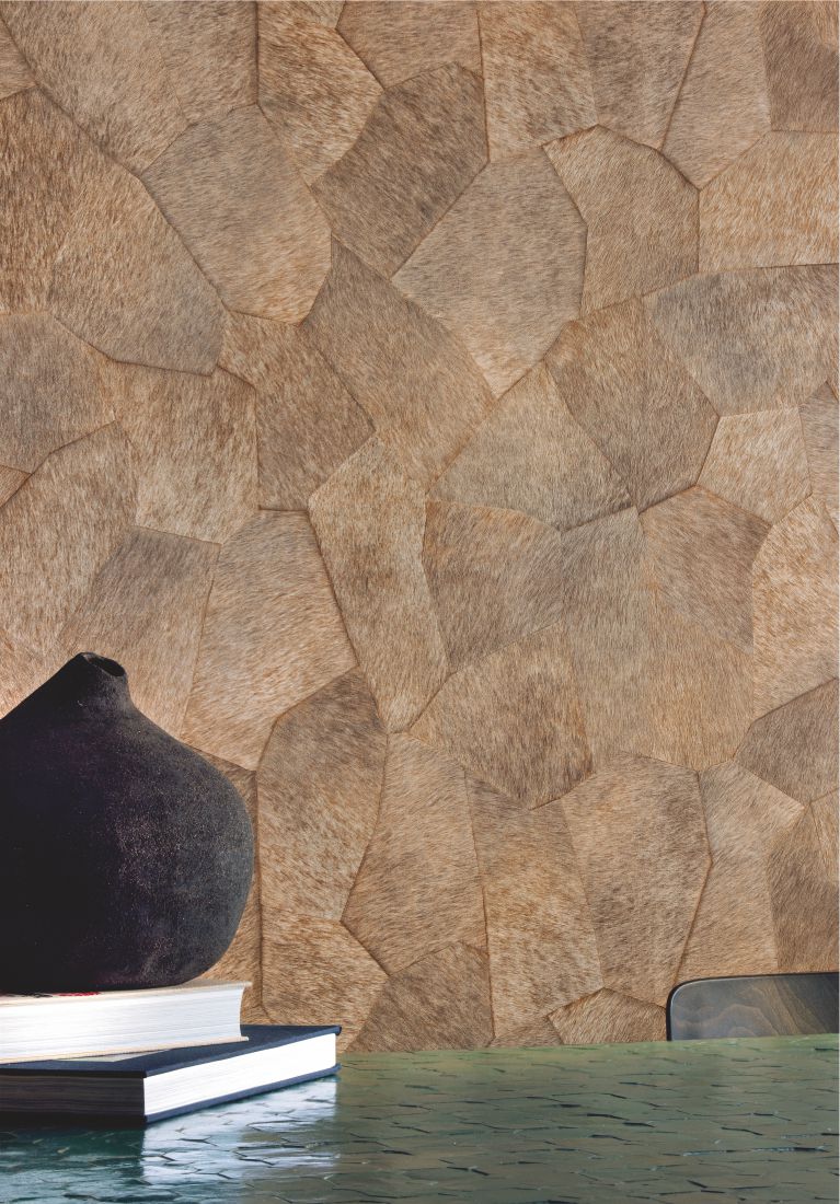 These vinyl creations faithfully recreate the look and feel of wild animal fleeces, sometimes departing from them to retain their raw energy. A journey of unique textures created using a specific technological combination of rotogravure and embossing cylinders. 5 panoramic prints complete the collection.