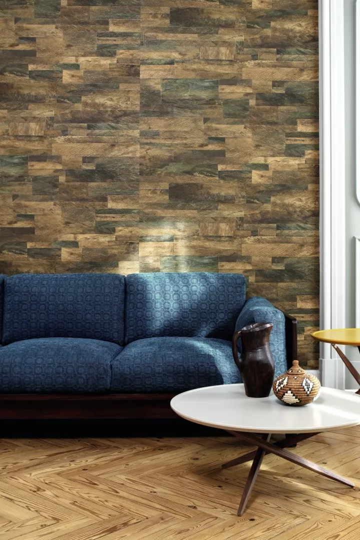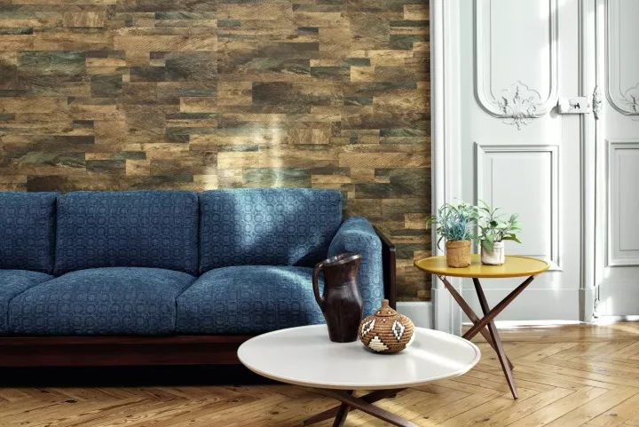 Patchwork of palmtree wood aspect on a vinyl embossed wallpaper
