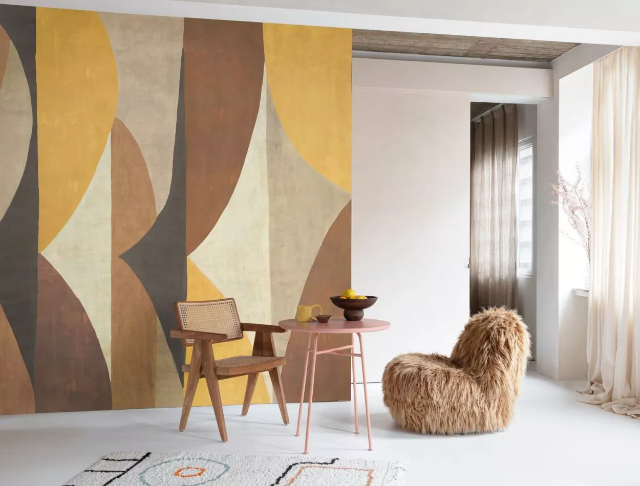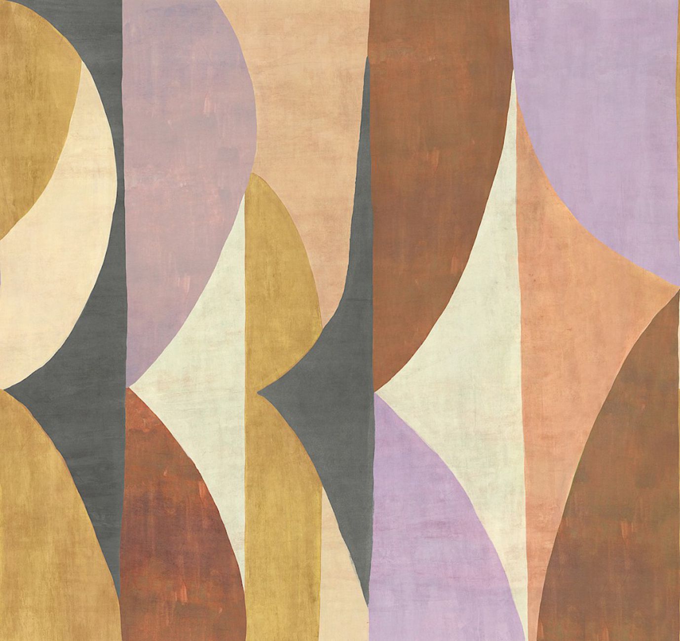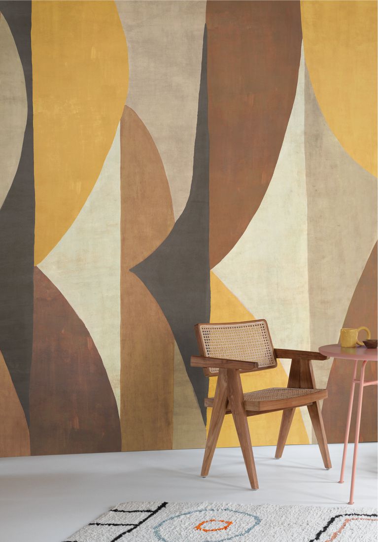 The panoramic Luana wallpaper also brings a pop of colour. The technique used here was inspired by fresco painting, a traditional art form that mixes colour pigments with lime. This style of painting creates patina and hue within each colour. Combining several contrasting hues in a gently undulating pattern across large swathes of colour gives the design a monumental feel.