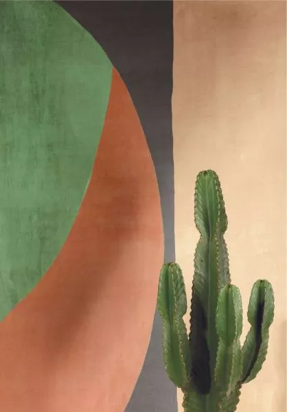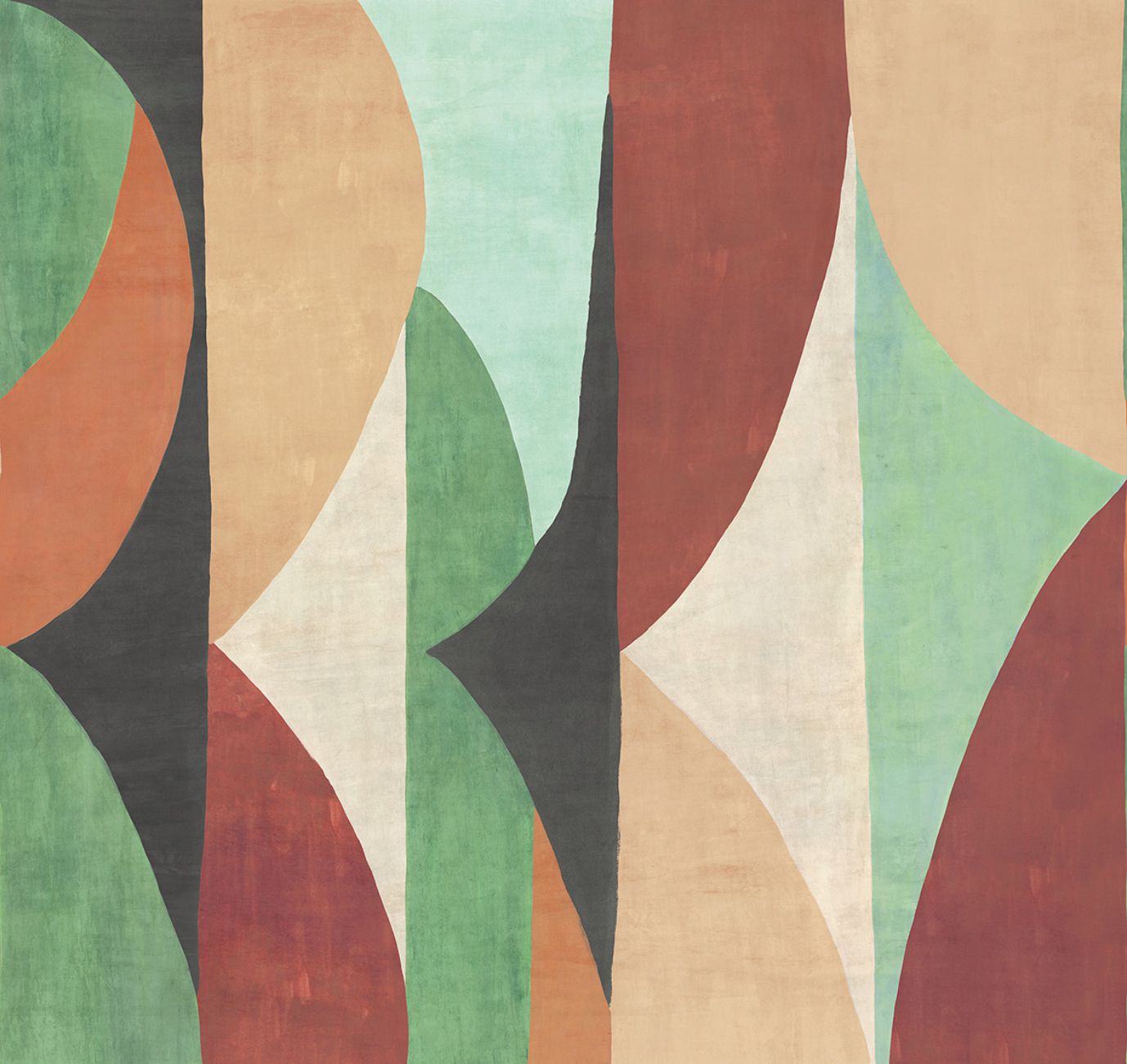 The panoramic Luana wallpaper also brings a pop of colour. The technique used here was inspired by fresco painting, a traditional art form that mixes colour pigments with lime. This style of painting creates patina and hue within each colour. Combining several contrasting hues in a gently undulating pattern across large swathes of colour gives the design a monumental feel.