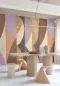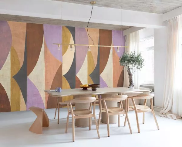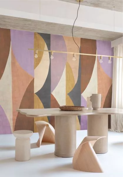 The panoramic Luana wallpaper also brings a pop of colour. The technique used here was inspired by fresco painting, a traditional art form that mixes colour pigments with lime. This style of painting creates patina and hue within each colour. Combining several contrasting hues in a gently undulating pattern across large swathes of colour gives the design a monumental feel.