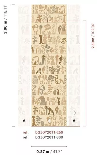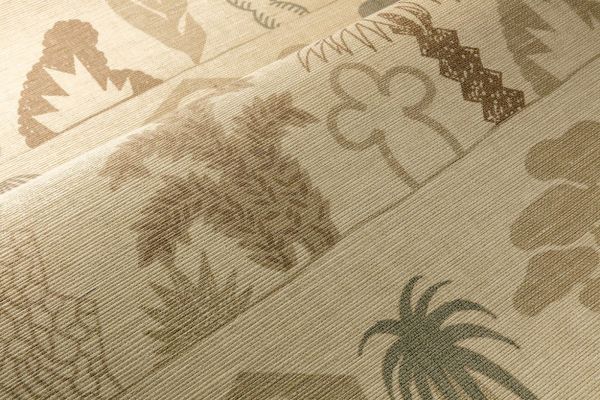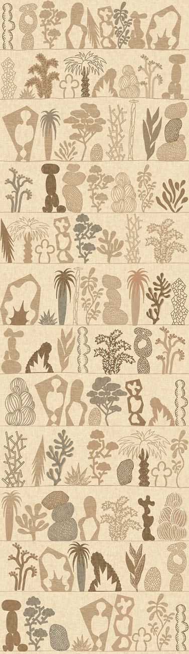 Textile and paper cut-outs are glued on a textile base. Embroidery and paint are added to create special effects and a 3-dimensional feel. Inspired by Matisse’s decoupage art and Baya’s bizarre, decorative elements, the Gaudia design is a mix of several techniques and structures. The textile print enhances the effect of the sisal it is printed on.