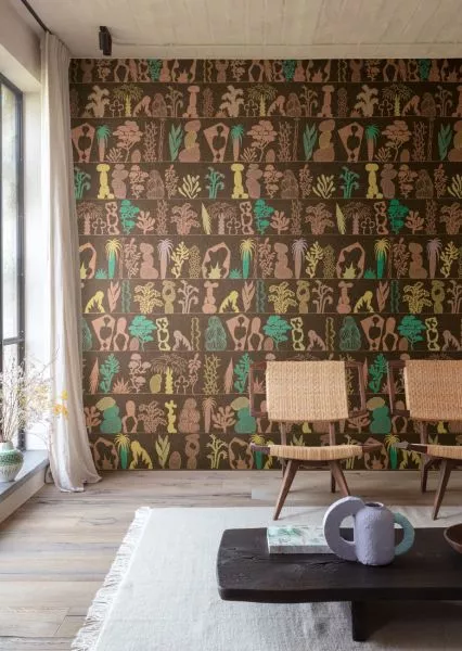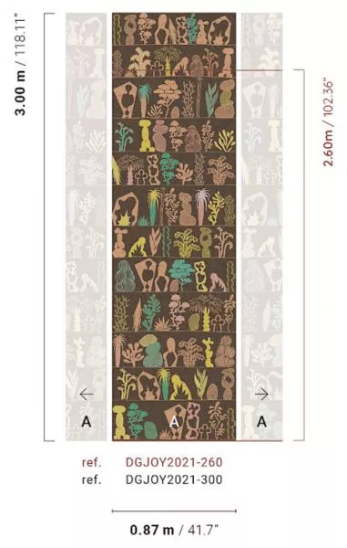 Textile and paper cut-outs are glued on a textile base. Embroidery and paint are added to create special effects and a 3-dimensional feel. Inspired by Matisse’s decoupage art and Baya’s bizarre, decorative elements, the Gaudia design is a mix of several techniques and structures. The textile print enhances the effect of the sisal it is printed on.