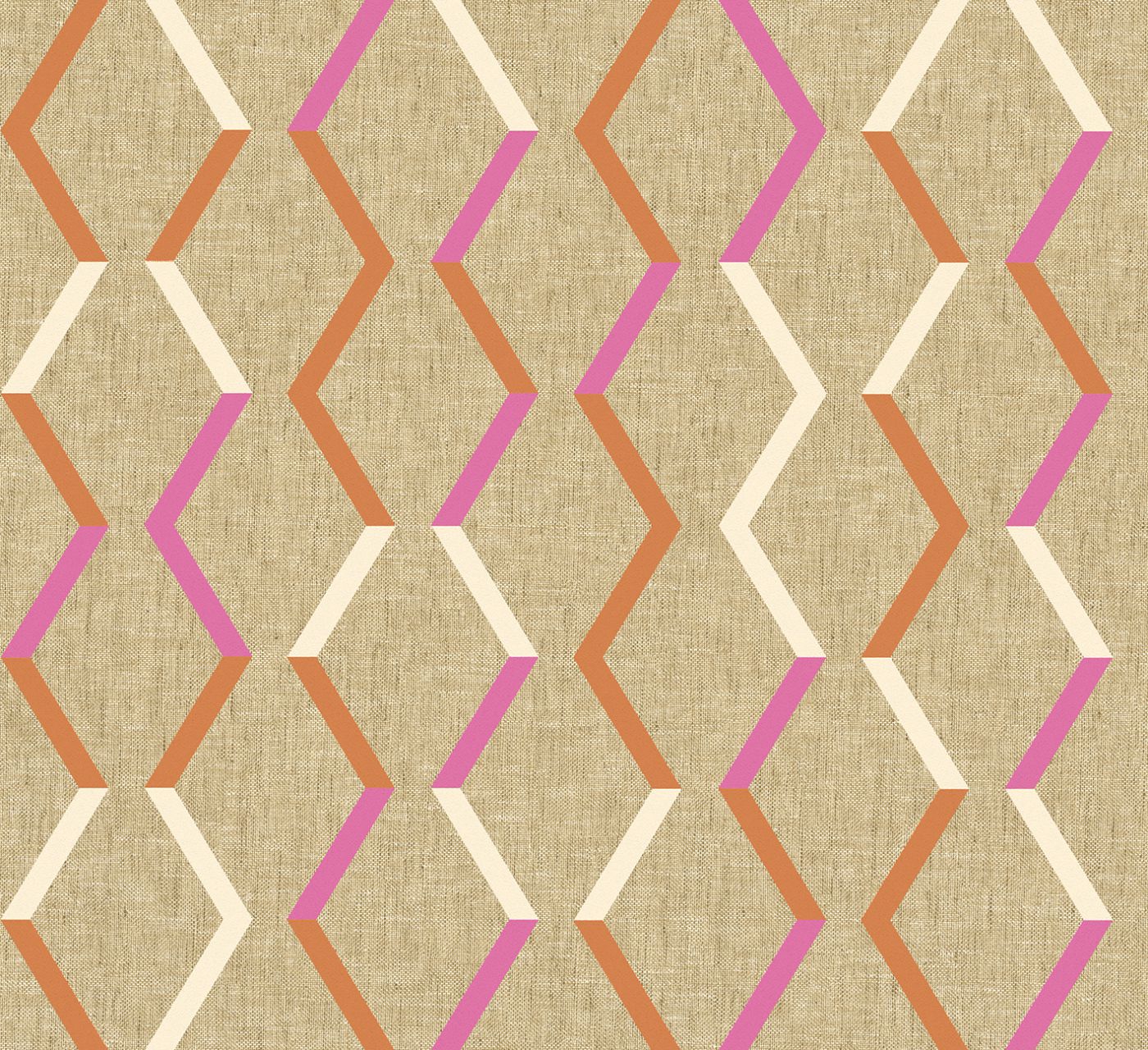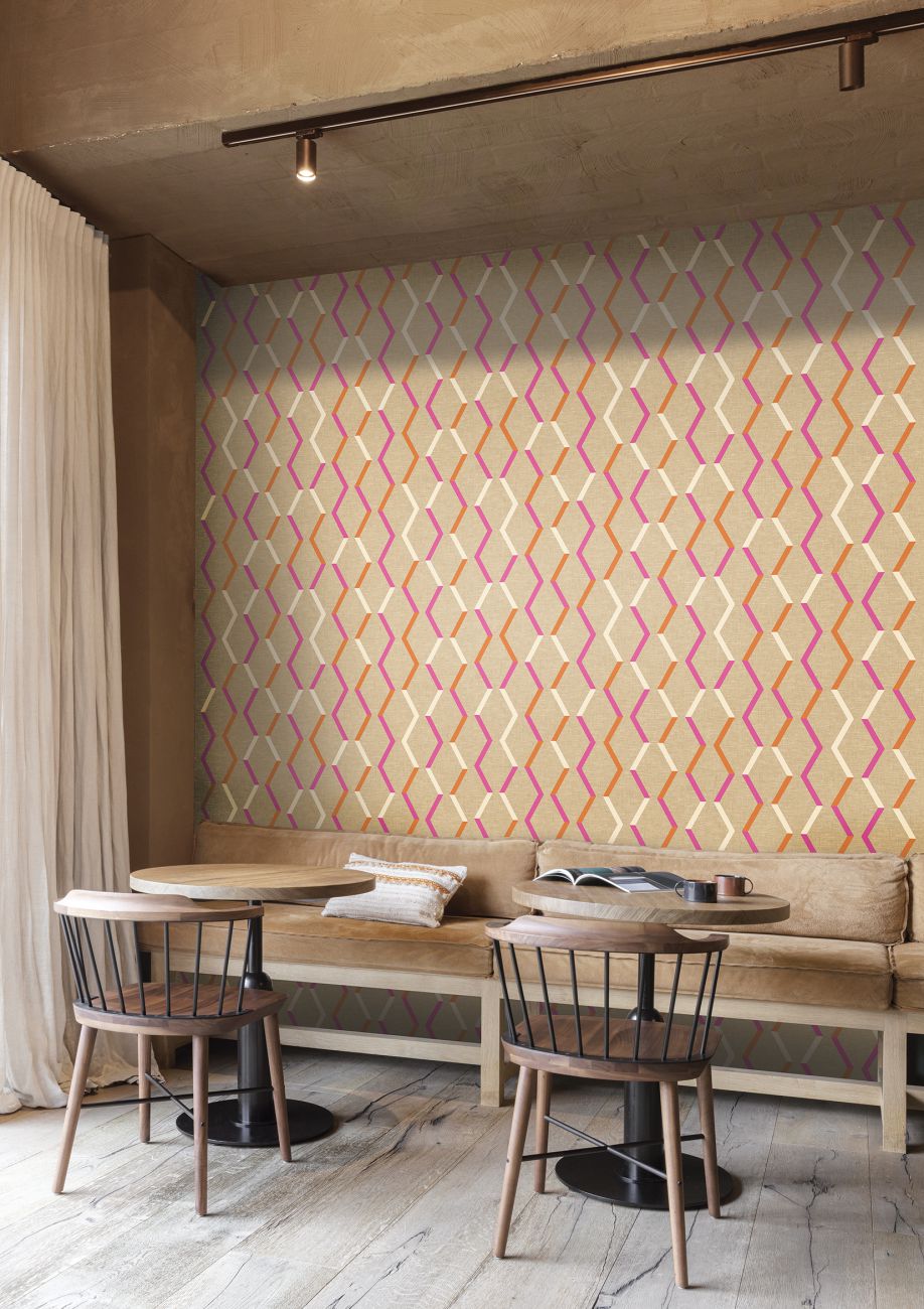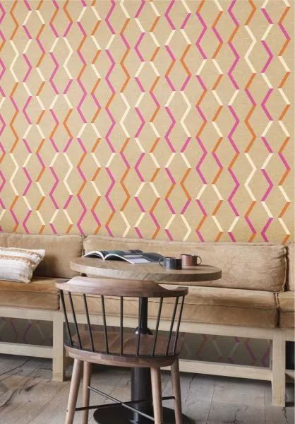 Digitally cut and pasted slithers of colour form an infinite Zigzag pattern. Printed on the textile background of the Telis design, the pattern forms a perfect match with the plain wallcovering. The design’s uplifting zingy colours are set against neutral tones for maximum impact.