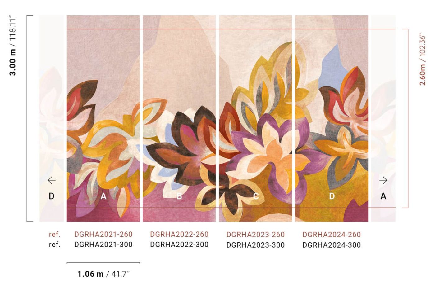 Material: Braillestructure on Non woven Dimensions: 4 Panels to 1,06m x 2,6m / in total 4,24m width x 2,6m lenght Match: 4 Panels in order DGRHA2021 - DGRHA2022 - DGRHA2023 - DGRHA2024 Fire retardancy: ASTM E84 Class A; EN13501-1 B-s1, d0 Washability: extra washable Light resistance:Good lightfastness How to paste:Paste the wall How to remove:Strippable