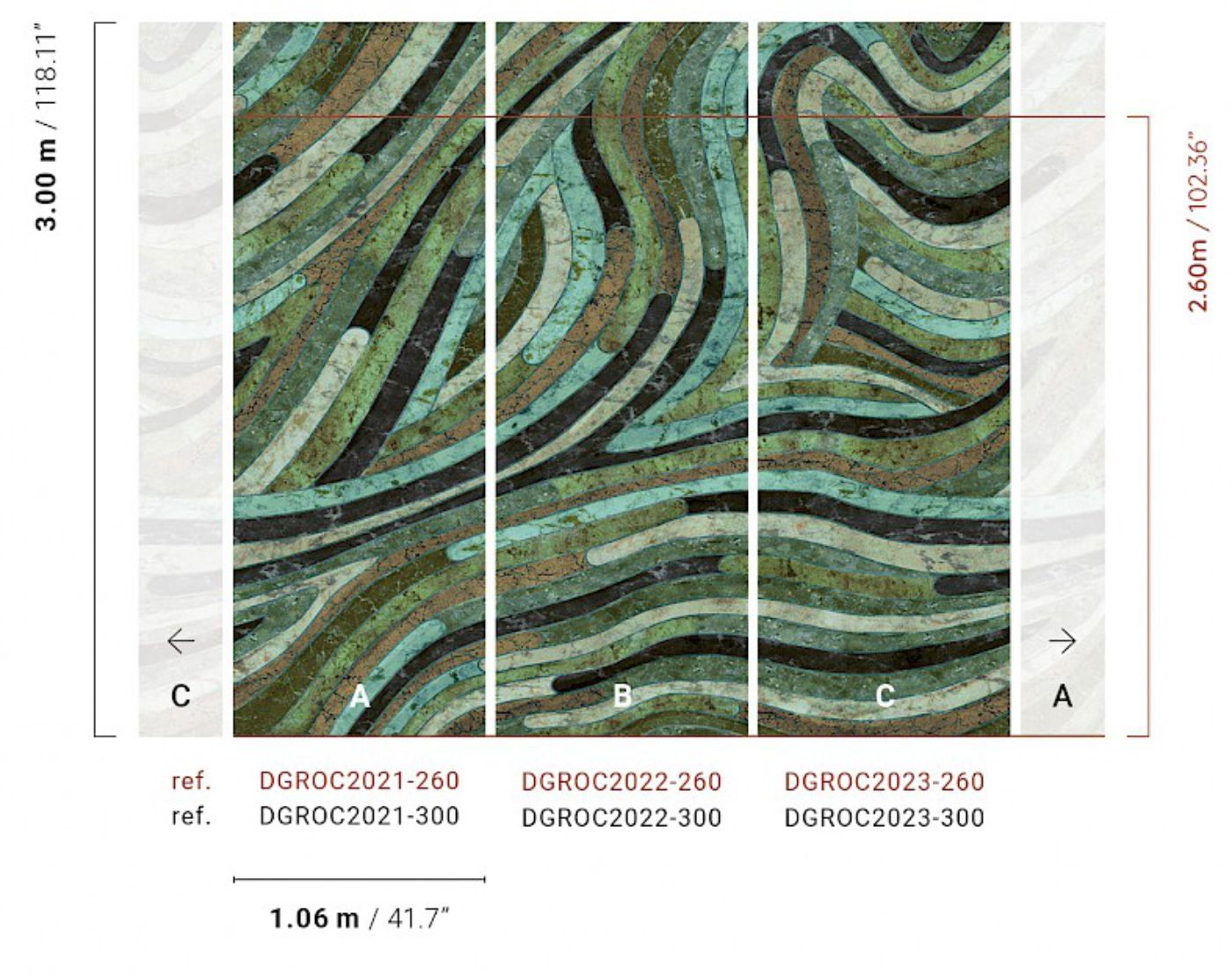 The panoramic Serpentine wallpaper resembles a magnificent masterpiece of inlaid marble. Its meandering, undulating pattern softens the coolness of the stone effect for a warm and sensuously fluid result.