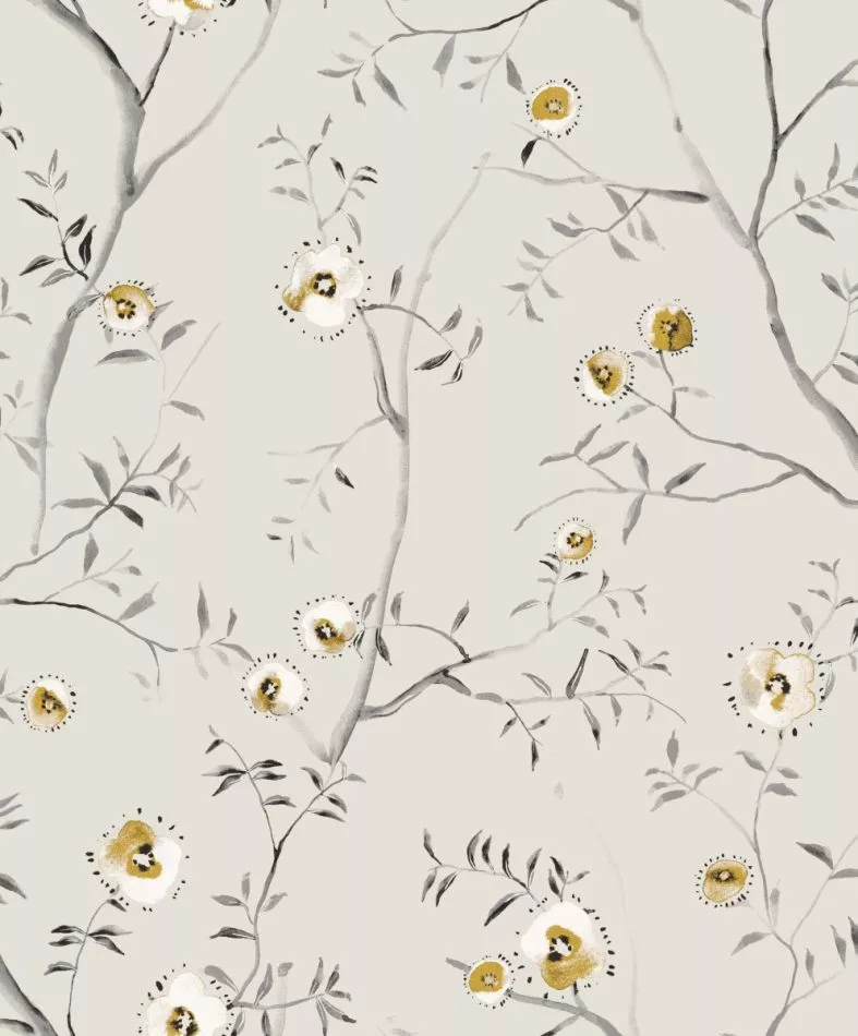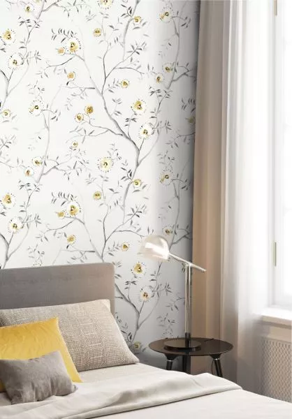 Our wallcovering Sari blossoms with flowers, a nod to the famous elaborate ‘sari’ garment traditionally worn by women throughout India. The hand-painted blooms on our wallcovering are finished with a glossy effect, with a gently faded effect on the leaves and branches.