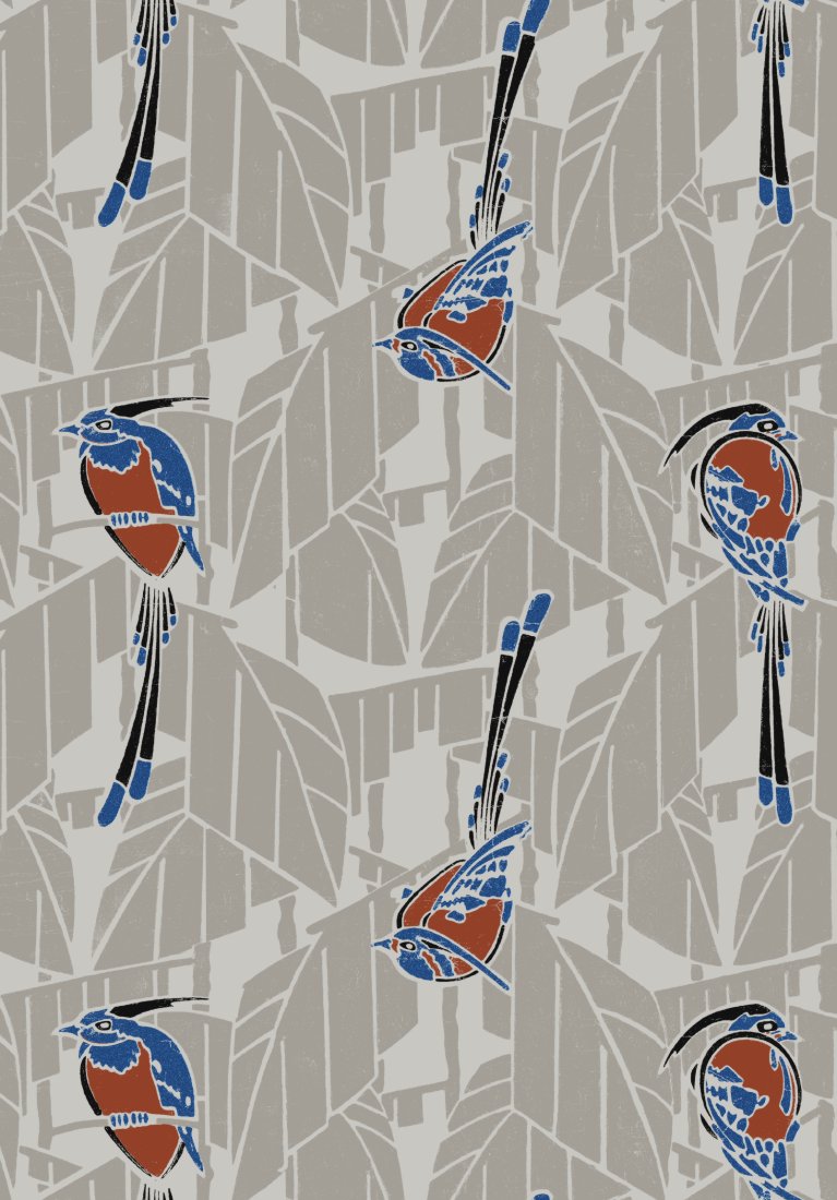 In transition from figuration to abstraction, these birds complement the stylized palm leaves in the backround. It is as if this birds, with their flamboyant feathers, are jumping from one leaf to another, giving the KARDINAL design a certain flair and playfulness.