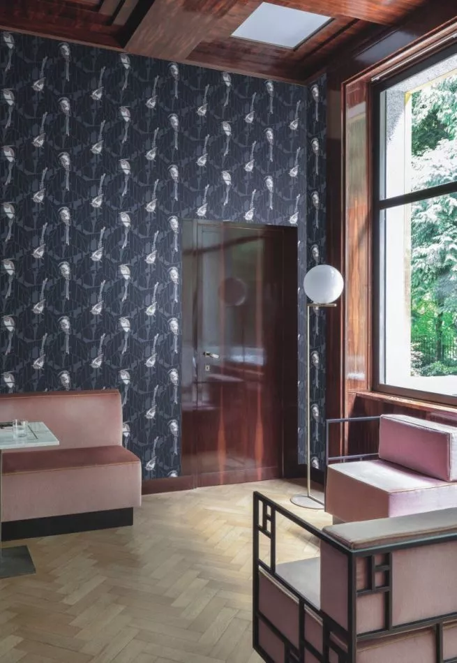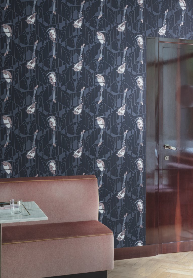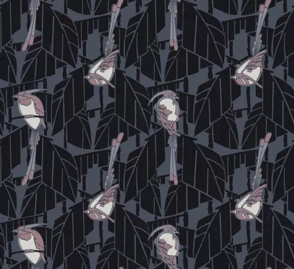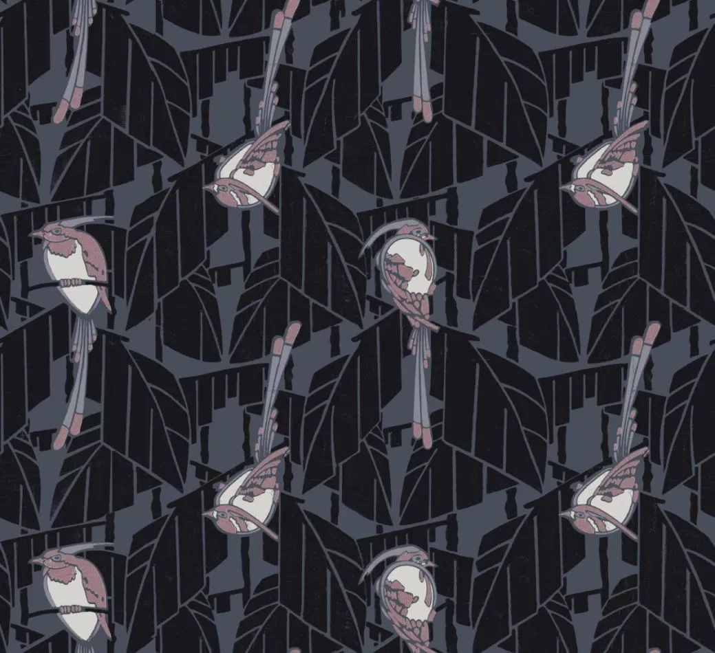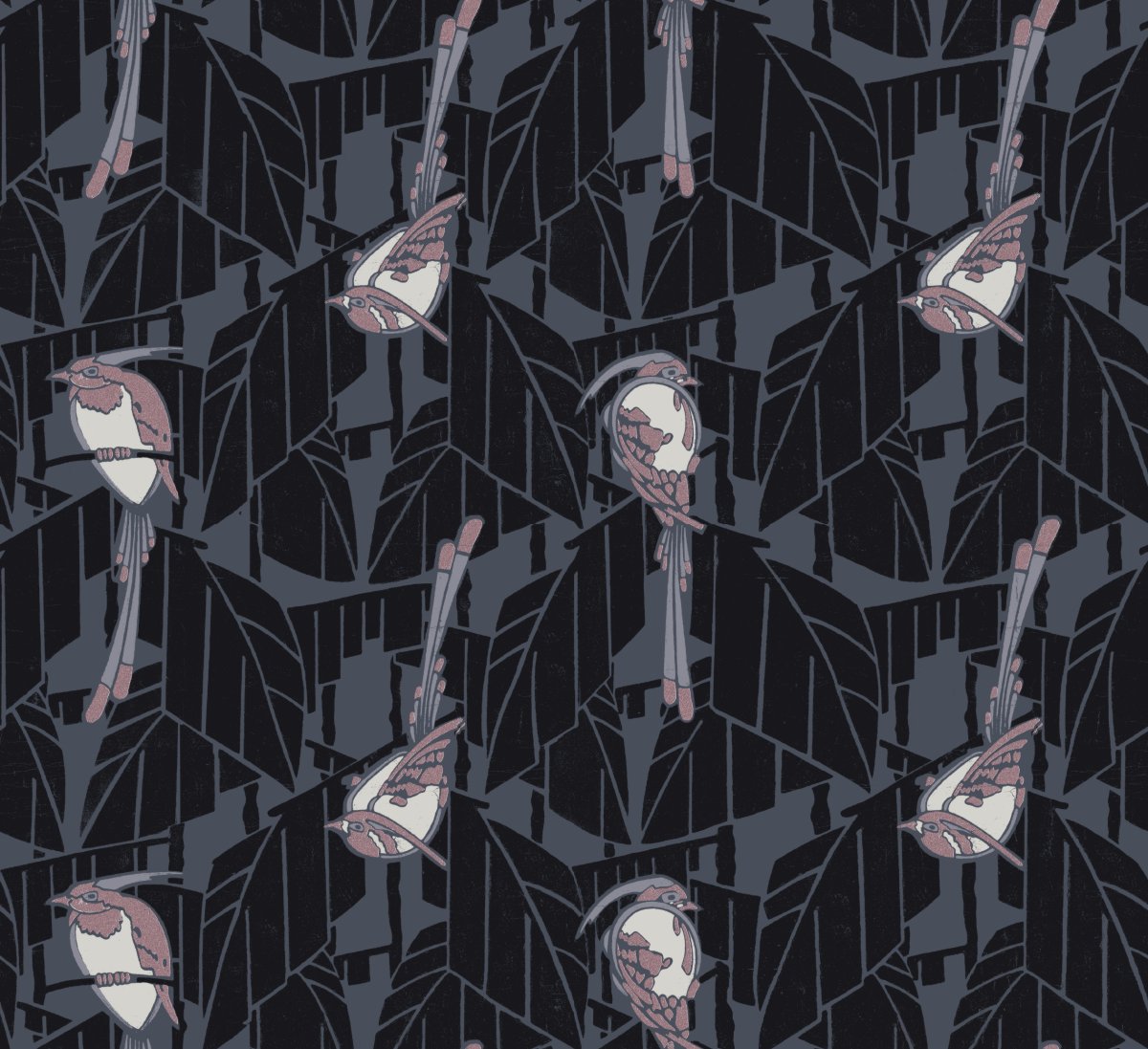 In transition from figuration to abstraction, these birds complement the stylized palm leaves in the backround. It is as if this birds, with their flamboyant feathers, are jumping from one leaf to another, giving the KARDINAL design a certain flair and playfulness.