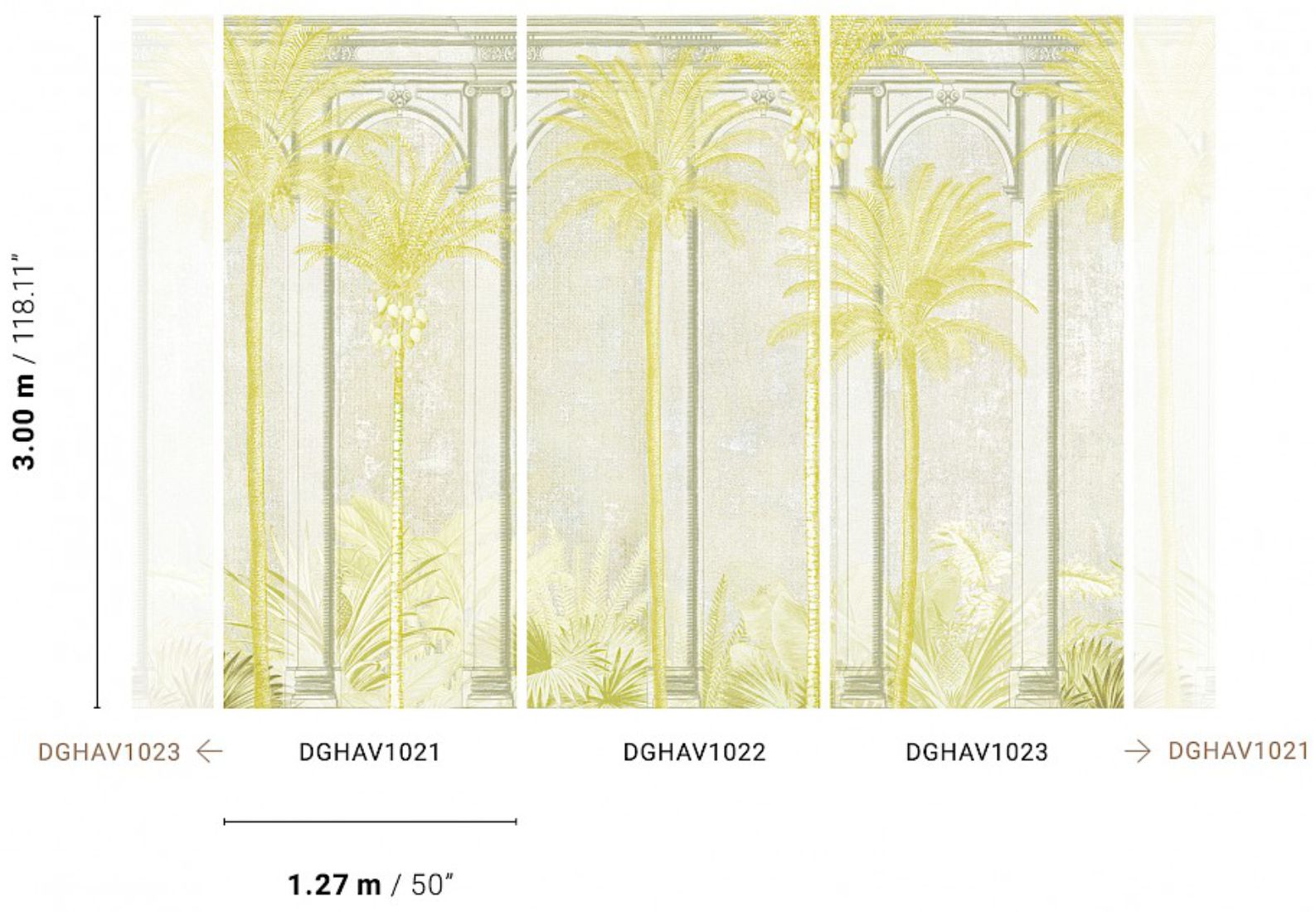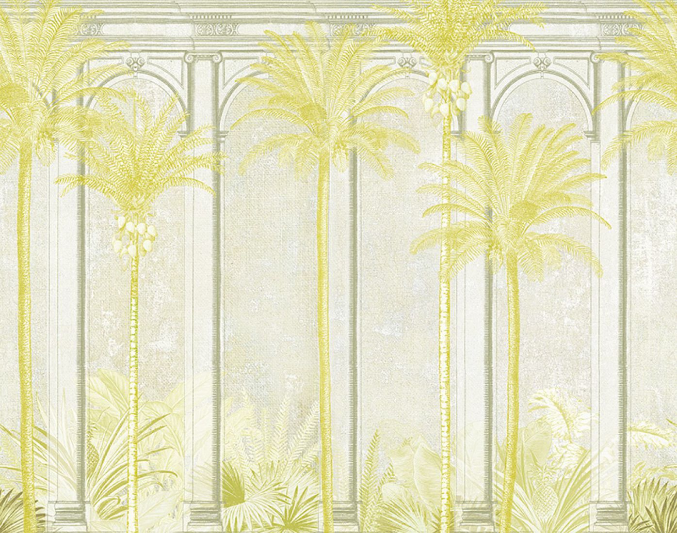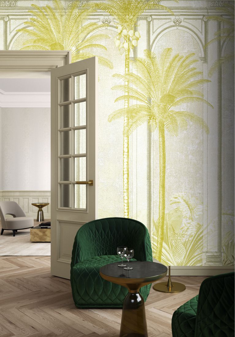 The digitally-printed Habana wallpaper condenses the entire collection into 1 striking design: a craquelure-effect wall replete with imposing arch, towering palm trees and an understory of tropical vegetation. The perfect combination of plants and architecture, available in a variety of subtle colours.