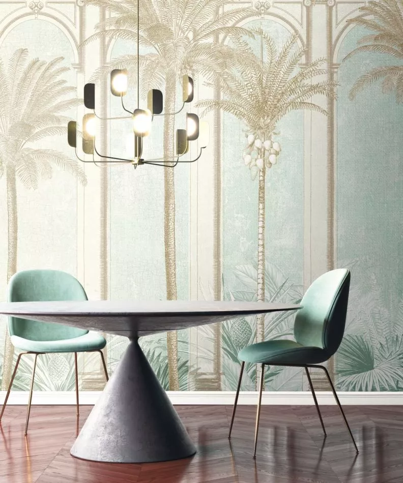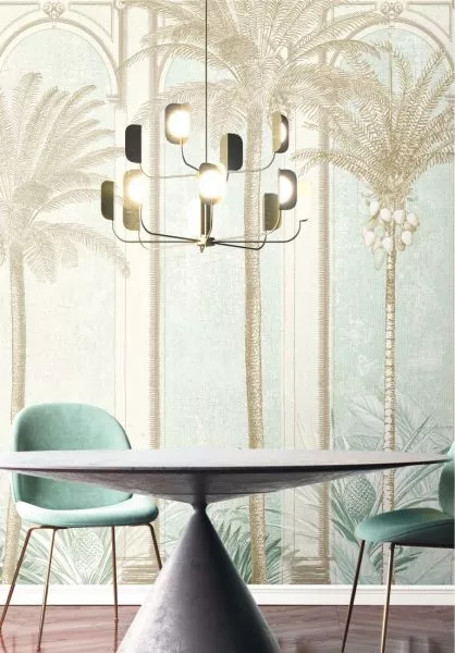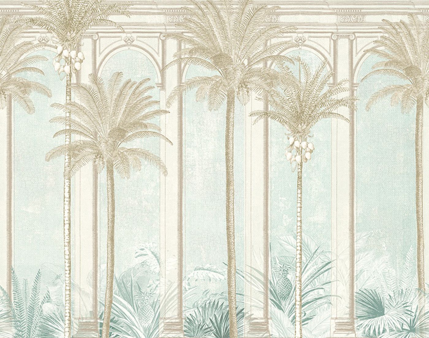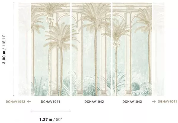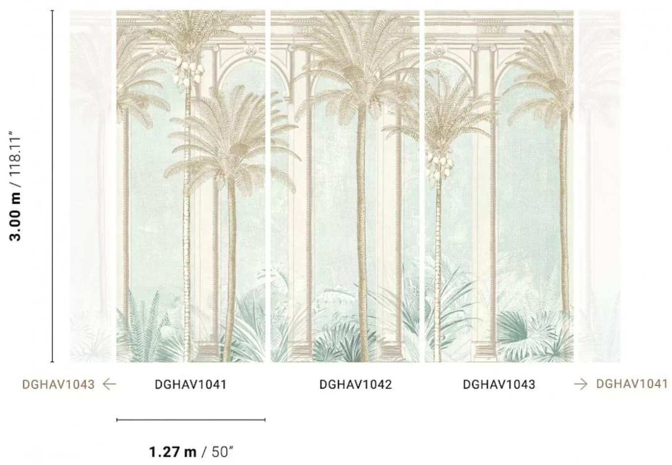 The digitally-printed Habana wallpaper condenses the entire collection into 1 striking design: a craquelure-effect wall replete with imposing arch, towering palm trees and an understory of tropical vegetation. The perfect combination of plants and architecture, available in a variety of subtle colours.