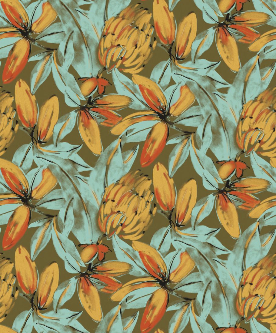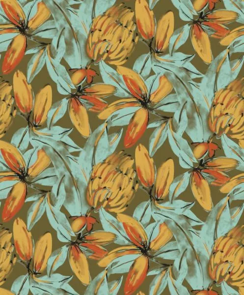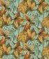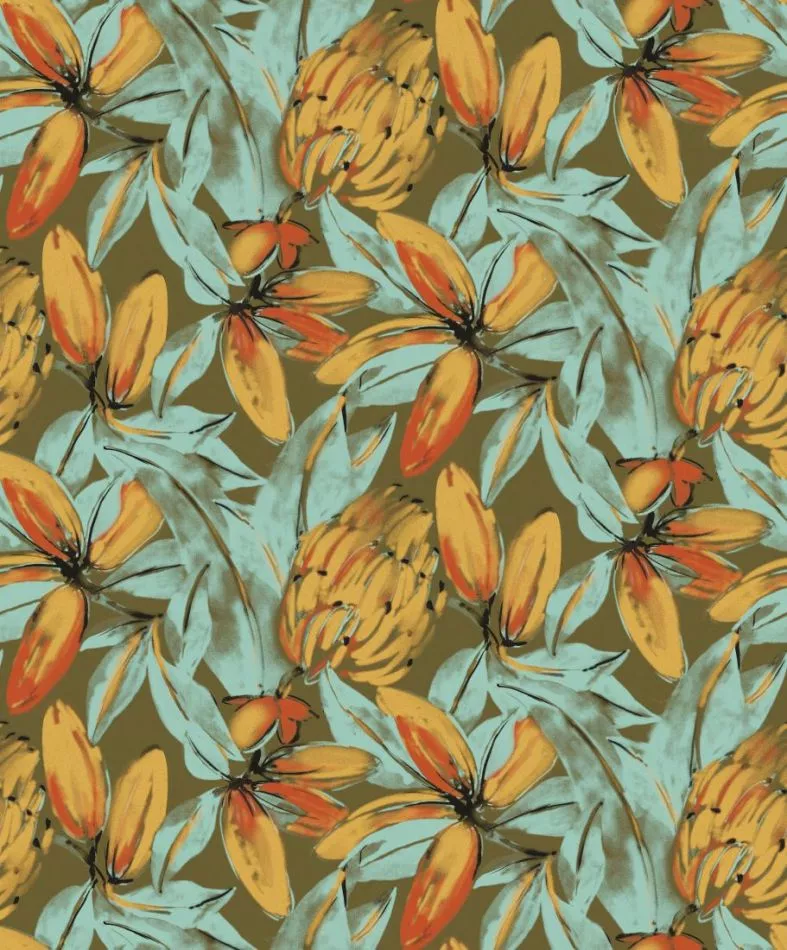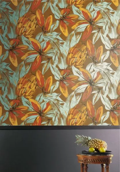 Our hand-painted Constanza and Frida wallpapers each invoke the exotic with their bright colours and tropical fruits. Constanza features a dazzling display of almost life-size papayas and bunches of ripe bananas. The voluptuous fruit boasts a glossy sheen, in pleasing contrast to the matte leaves.