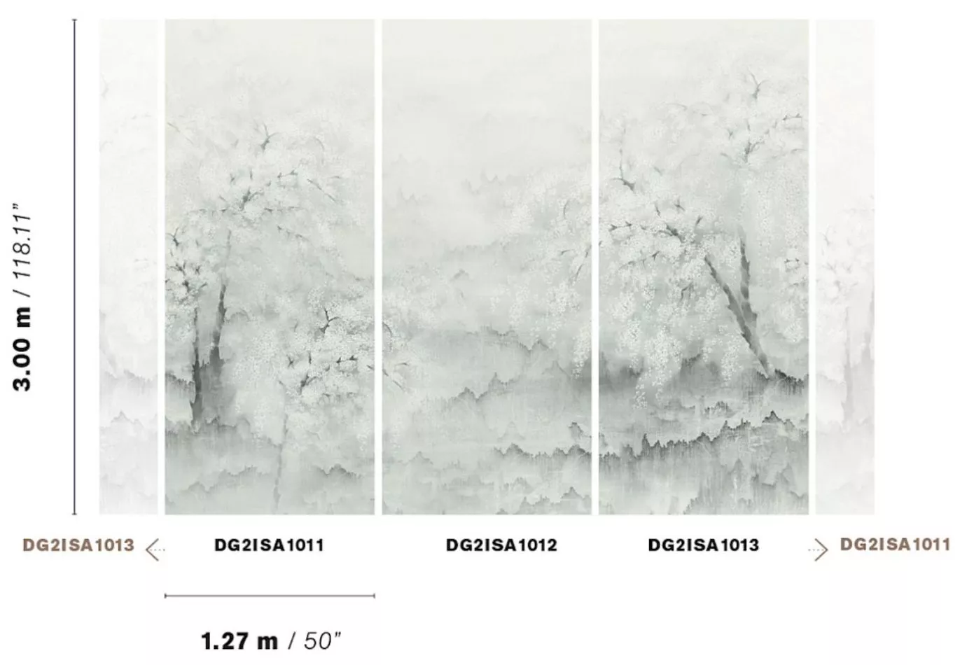 Material: Vinyl on non woven backing Dimensions: 3 x 1,27m x 3m Match: 3 Panels in order DG2ISA1011 - DG2ISA1012 - DG2ISA1013 Fire retardancy: EUROCLASS B-s1, d0 Light resistance:Good lightfastness How to paste:Paste the wall How to remove:Strippable