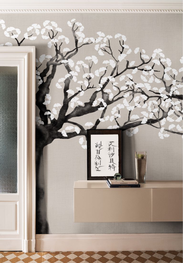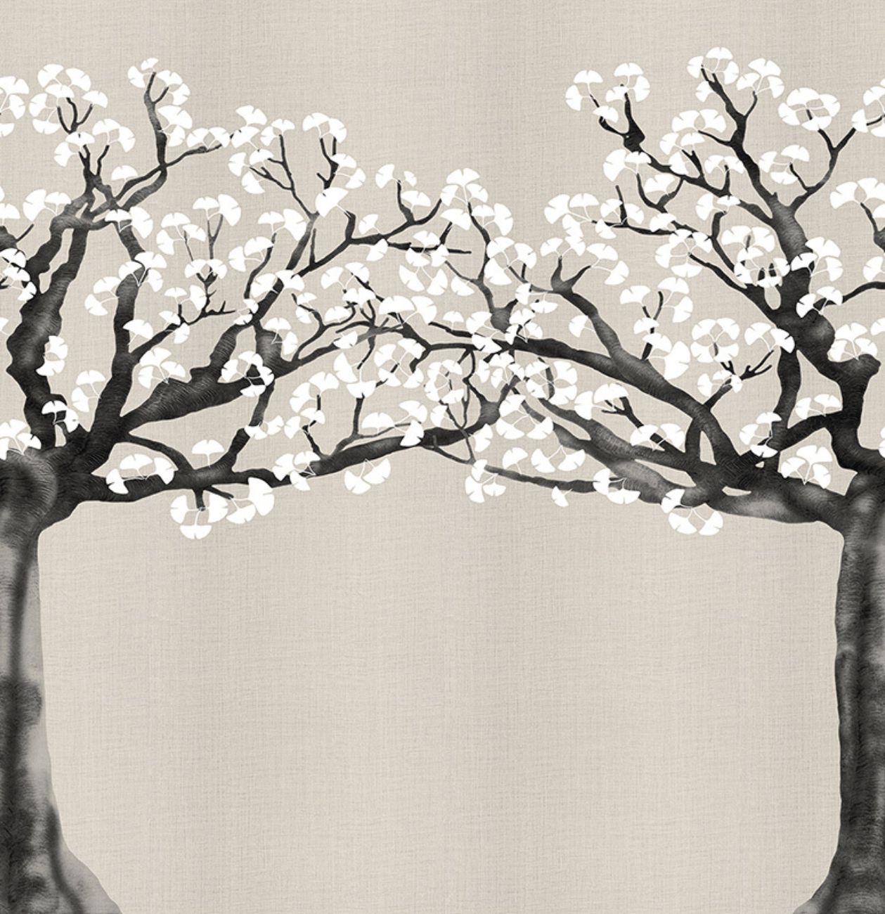 Two white-leaved ginkgo trees mirror one another in this wallpaper. Venerated as a sacred tree because it was believed to protect against bad spirits and because it represented the symbol of the coincidence between opposites. For the Japanese it represents rebirth and the beauty of existence.
