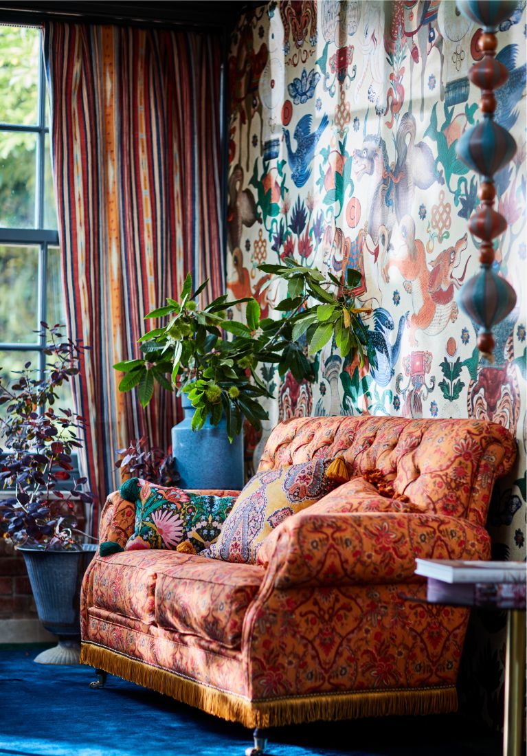 Expect the unexpected in the mystical world of INCANTATION. Where creatures roam freely through an enchanted setting, stay alert as you never know what lies around the corner. Exotic birdlife, ornamented horses and mythical dragon-like animals will surround you, as you wander through gardens filled with striking florae and intricate architectural figures. With backdrops of cream, dark blue and yellow, this vivacious print opens your senses as you imagine a rich, aromatic scent flowing through the air in this fascinating and captivating domain.