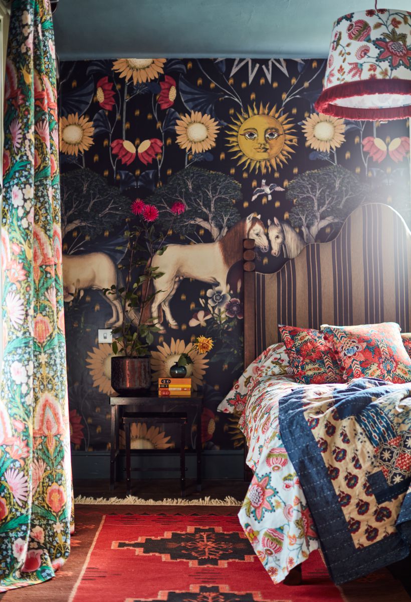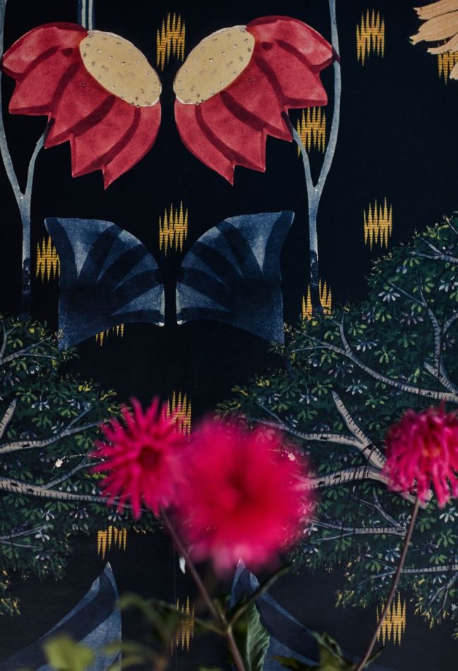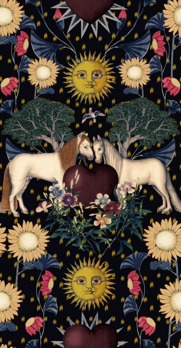 Meander through golden fields of sunflowers while wild horses graze under the shadow of woodland nearby. Symbolic hearts radiate a sense of comfort and peace as you lose yourself in the whimsical meadows which surround you with tranquillity. The sun warms your skin as you listen to the sound of birds flying above you. Evoking sounds and smells of long summer afternoons, the MIRAGE wallpaper, set on two contrasting backdrops, brings a restful ambience into the room.