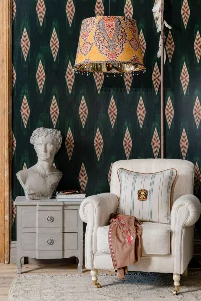 Luxuriate in the richness of hand sewn fabric with our diamond patterned MAIYSHA wallpaper which takes a painterly approach to timeless geometric shapes. Small diamonds filled with colourful echoing outlines, each layer seemingly hand sewn and celebrating the perfect imperfections of traditional textile crafts, with the overall form surrounded by organic blurs representing thread on the back of the fabric. MAIYSHA was especially created to complement wallpapers from the free-spirited WOODSTOCK Designer collection and makes for a great standalone statement piece too.