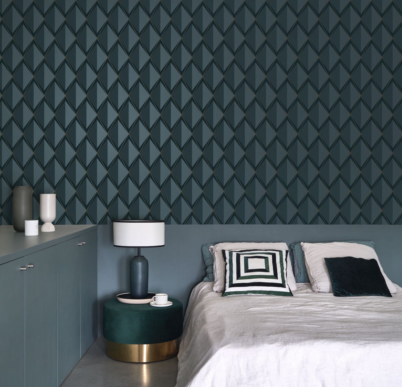 In the limelight. Back to the (silent) silver screen with Chaplin. The iridescent latticework is set-off by an extremely matte background. The difficult part is choosing between the distinctiveness of the taiga-green or the softness of the greige.