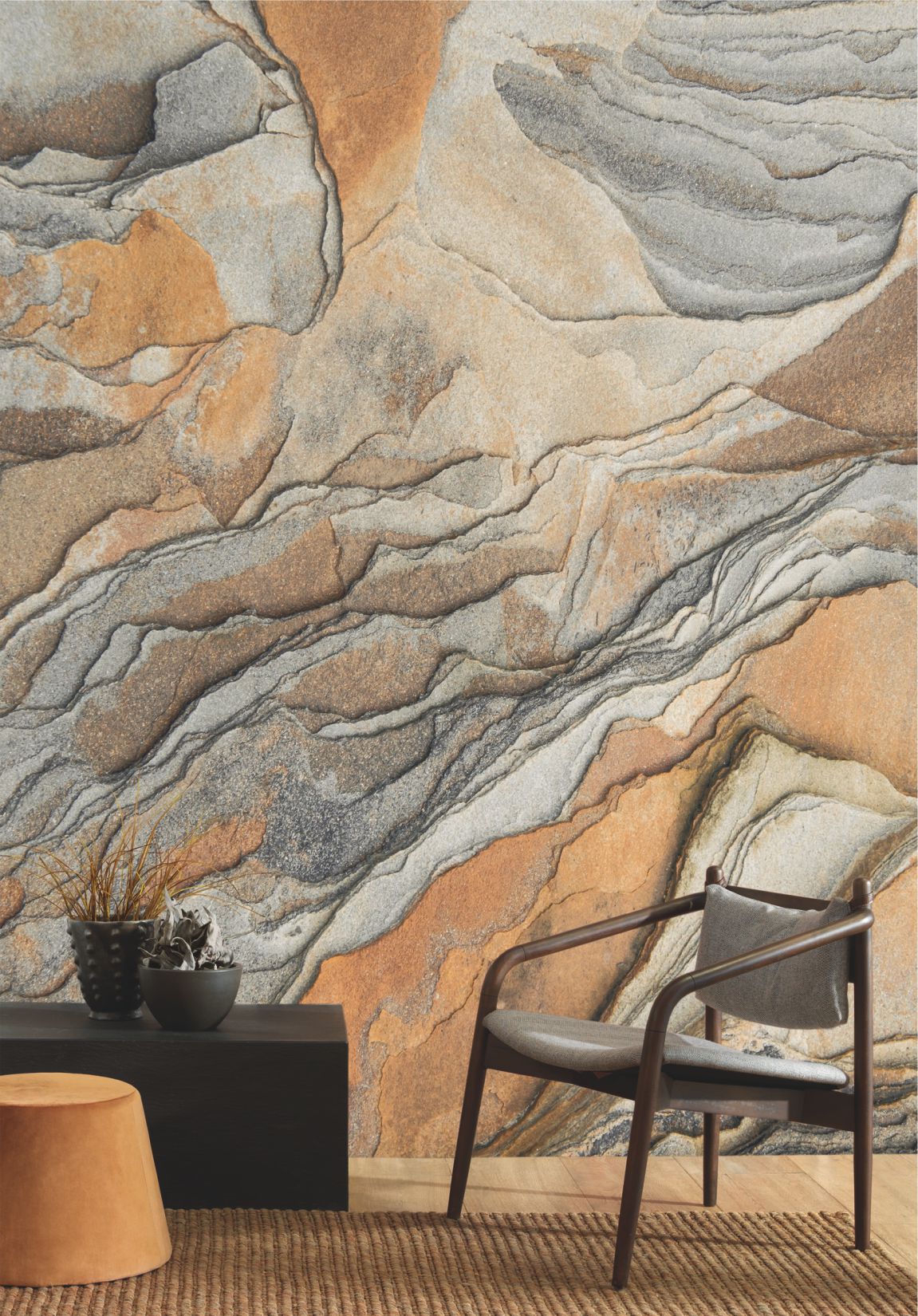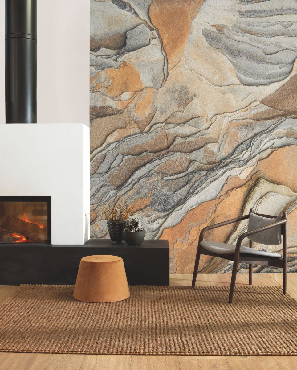 Close-up on a rock worn by time, the sun, the rain, the wind…We appreciate the details in its surprising shading from light-grey to an almost rust-coloured ochre, and its irregular and fascinating layers. A beautiful tribute to the mineral world, to immortalise its raw beauty inside the heart of human habitation.