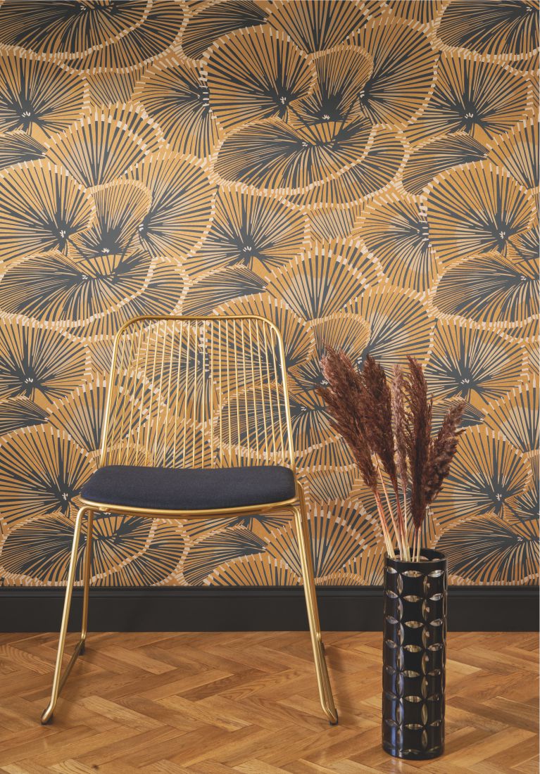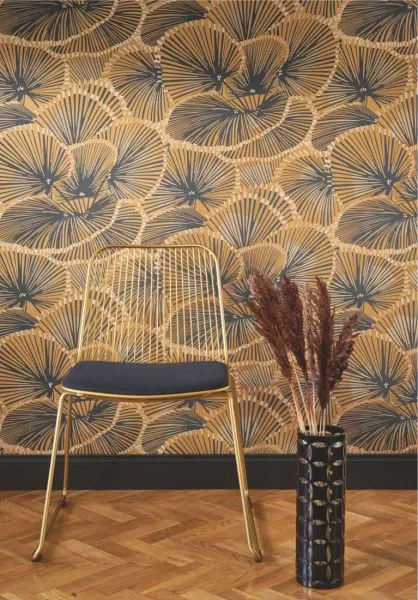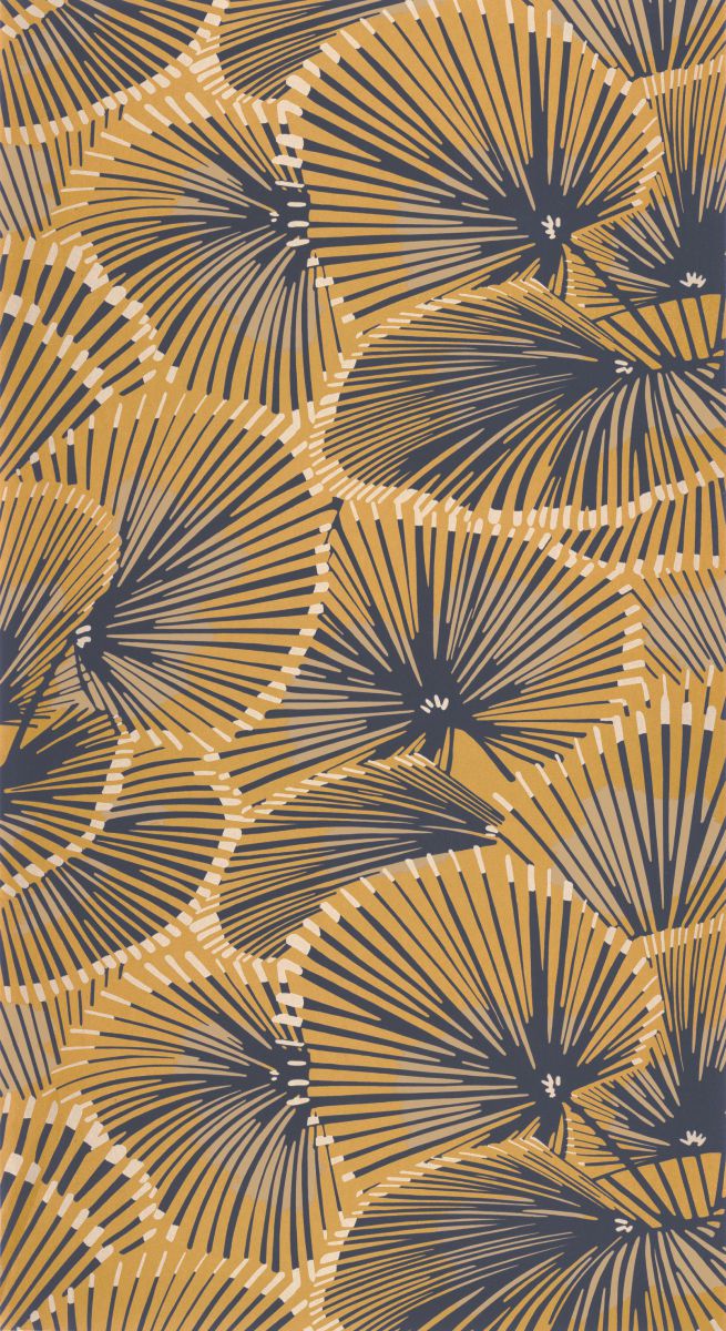 Welcome to one of New York's most famous cabarets: this is what Cabaret wanted to transcribe, with its large stylized fans inspired by dancers, its effervescent movement and its subtle colors. A real gem, this wallpaper is adorned with iridescent details on the tip of each fan palm.