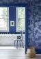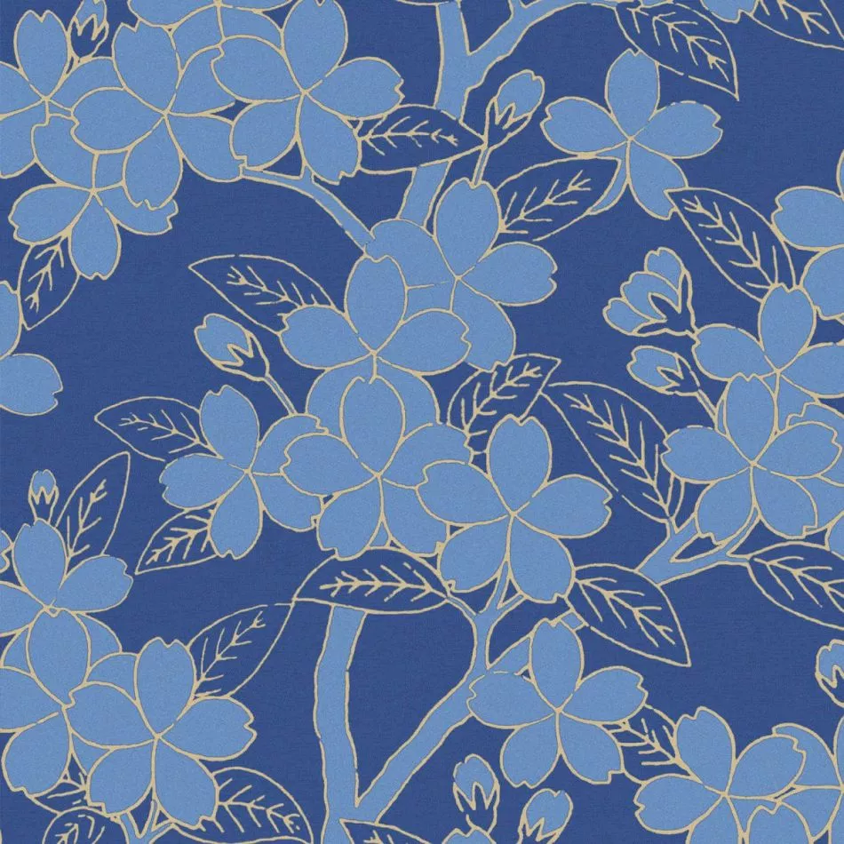 This wallpaper with oriental origins shows flowers and leaves on a silk background. The design has been repainted in three strong colors, including an intense, antique blue that gives the wallpaper a very special modern touch.