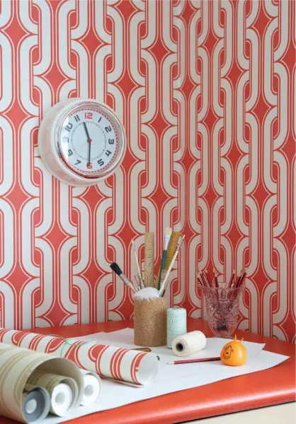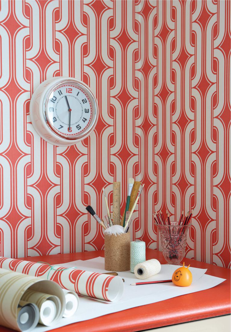 Two colourways of this iconic 1970s paper are known to have existed in a French book from 1975. Both originals were neutral in colour and printed on an embossed paper, giving the effect of linen. Whilst several of the contemporary interpretations are bolder in colour, one of the reproductions in this book is completely faithful to the original paper’s textured effect.