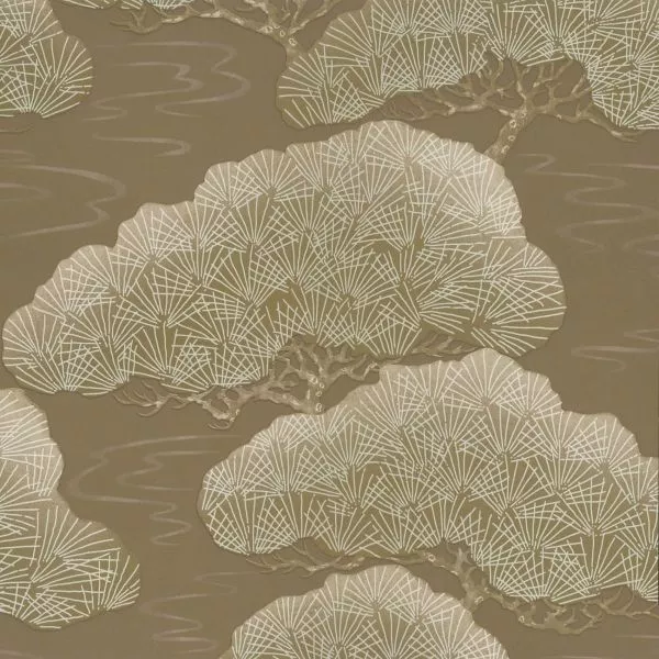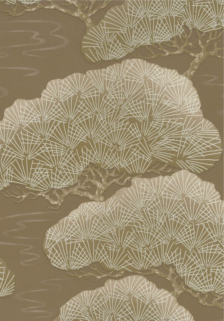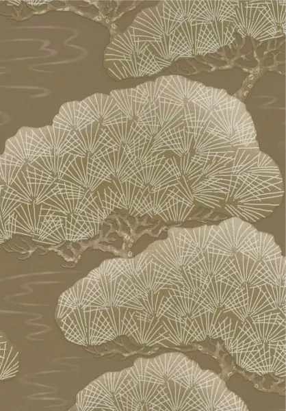 Drawn from an early 19th century silk kimono, an abstract depiction of Pine Trees emerging out of the clouds.