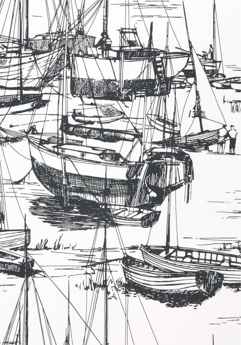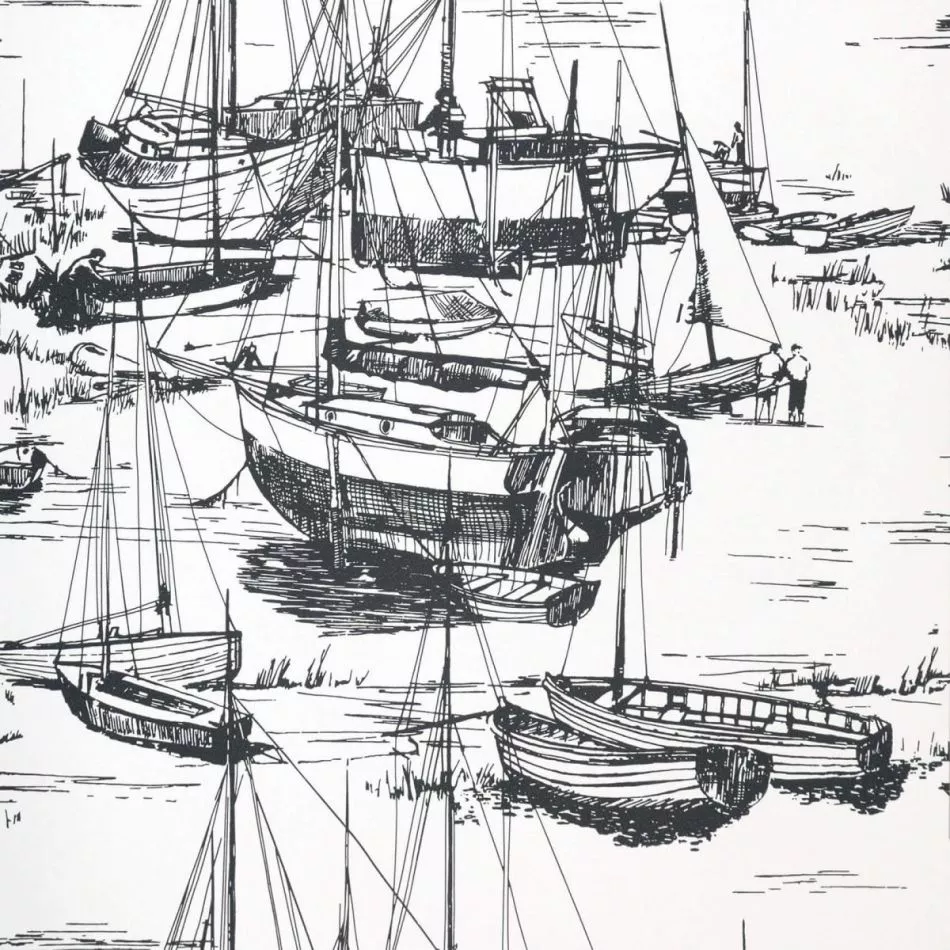 Zingara was the name given to this design in a John Line collection produced in 1960. The colourway Cerulean Sea is also completely faithful to the document found in the wallpaper archive at Manchester's Whitworth Art Gallery. The elegant freehand line quality of the original drawing serves additional charm to this relaxed scene of boats resting at anchor.