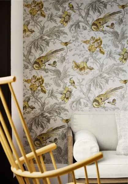 A large-scale, late-19th century wallpaper with a bold pattern of exotic birds and flowers. The paper had been used in a curving stairwell in Crowe Hall, a Suffolk manor house where the vertical nature of the trailing pattern emphasised the height of the room. It is likely to have been hung around the turn of the century and was recovered during extensive conservation work to the house much later. This design is an existing and much-admired part of the Little Greene portfolio; it is available in three new colourways as well as four existing ones.