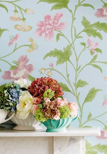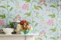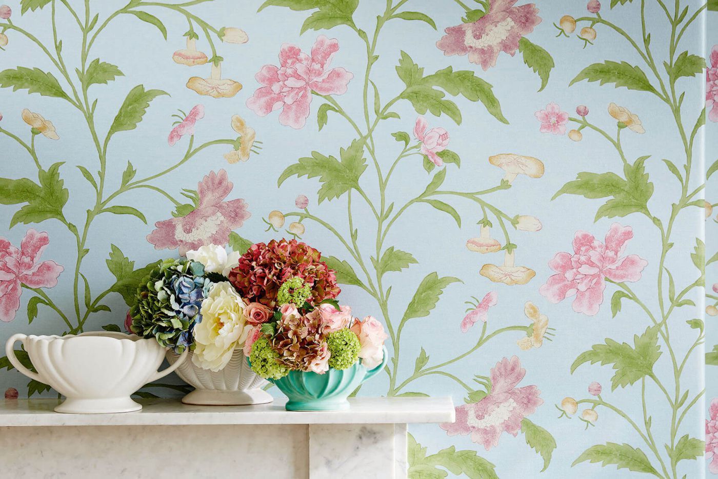 China Rose (c1885) is a classic flamboyant floral, taken from a late 19th Century French hand-painted ‘Peking Stripe’ fabric with a distinct Chinese influence. The distressed opaque colours in the leaves and petals portray the hand of the original artist, in contrast with a judicious modern-day use of mica and metallic inks as witnessed in some colourways.