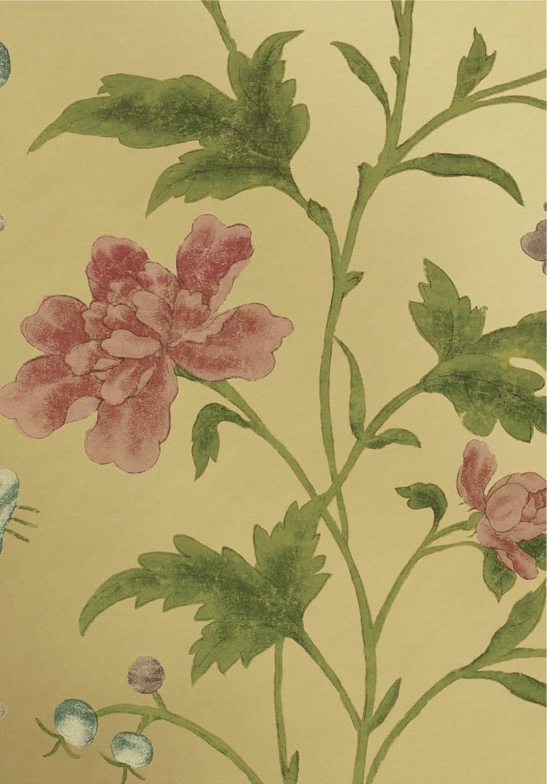 China Rose (c1885) is a classic flamboyant floral, taken from a late 19th Century French hand-painted ‘Peking Stripe’ fabric with a distinct Chinese influence. The distressed opaque colours in the leaves and petals portray the hand of the original artist, in contrast with a judicious modern-day use of mica and metallic inks as witnessed in some colourways.